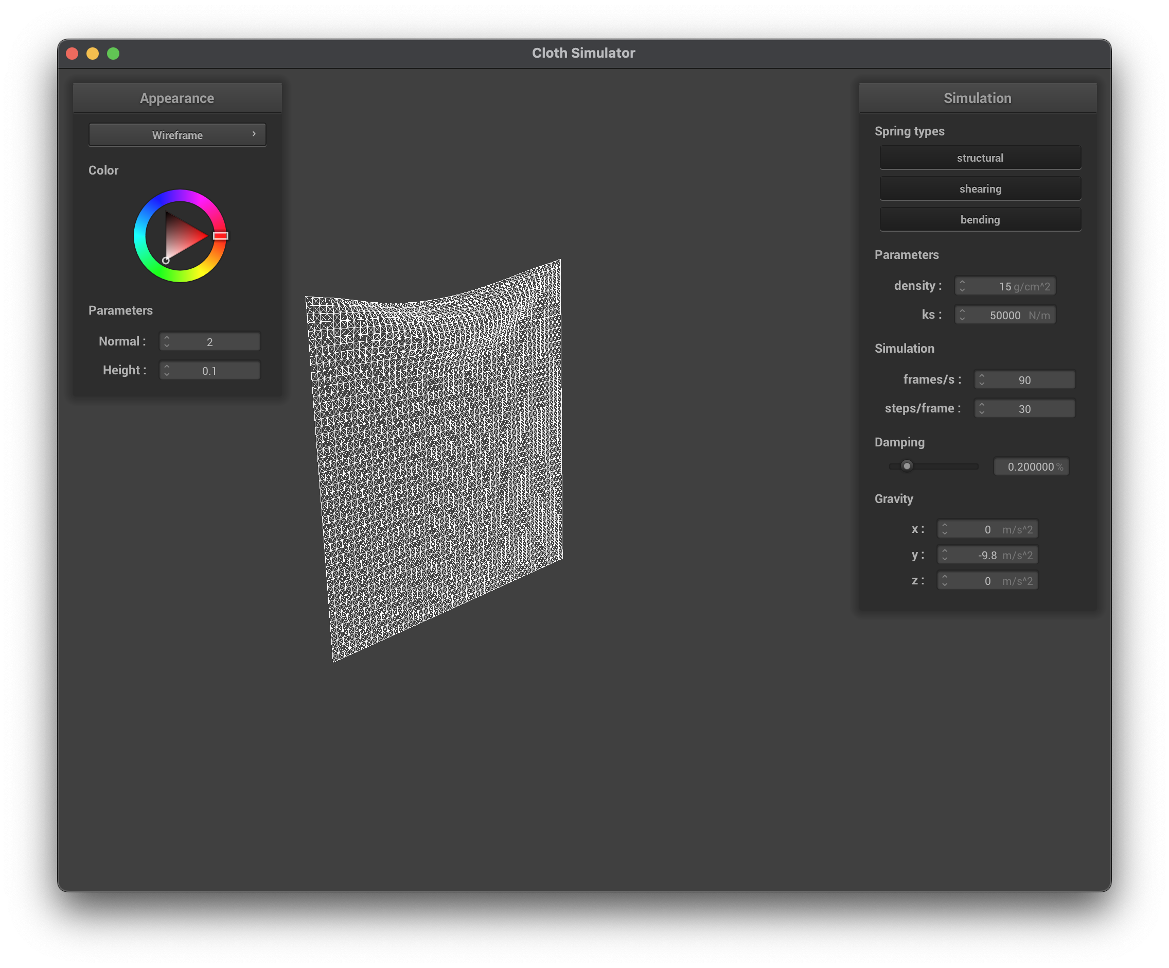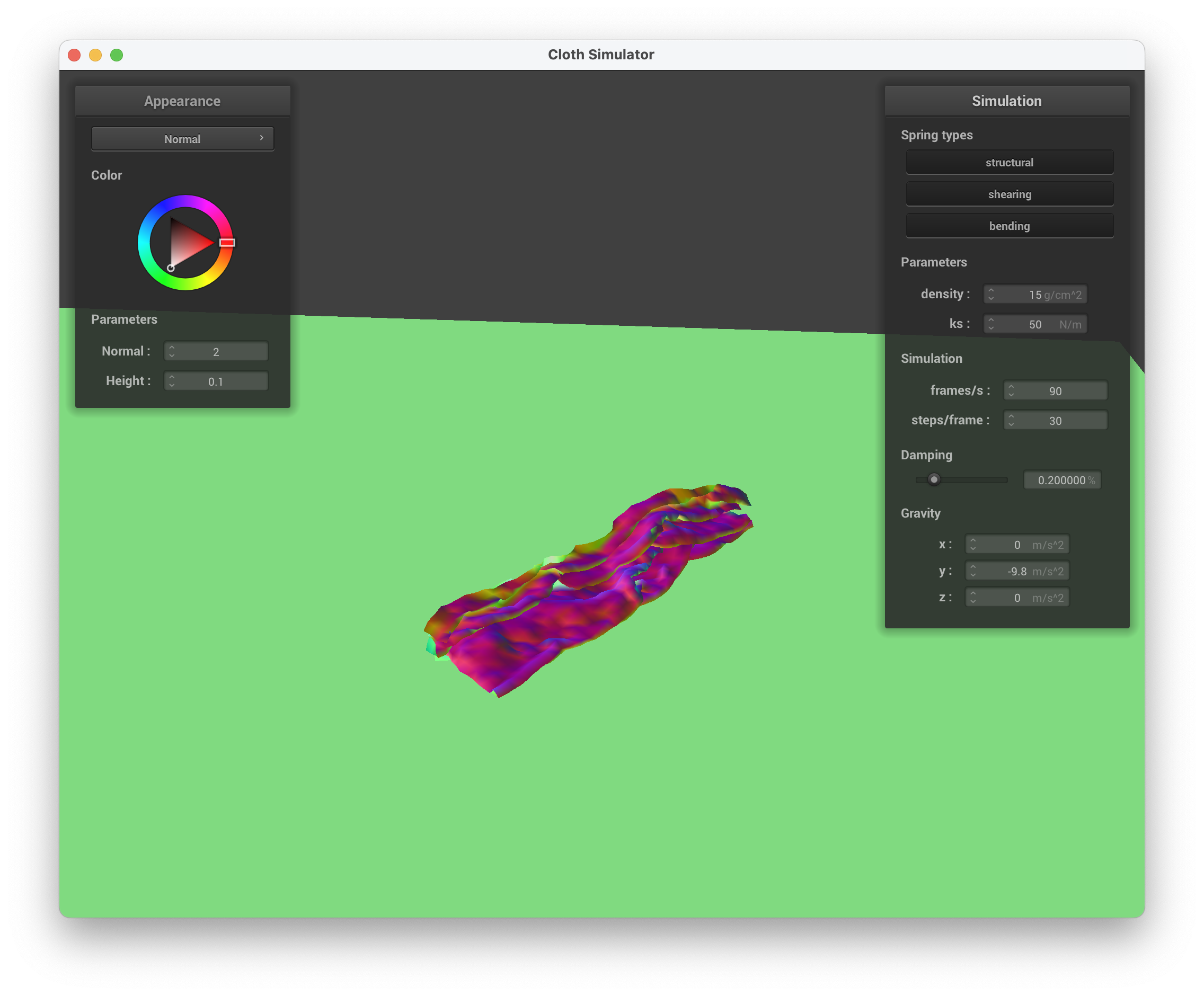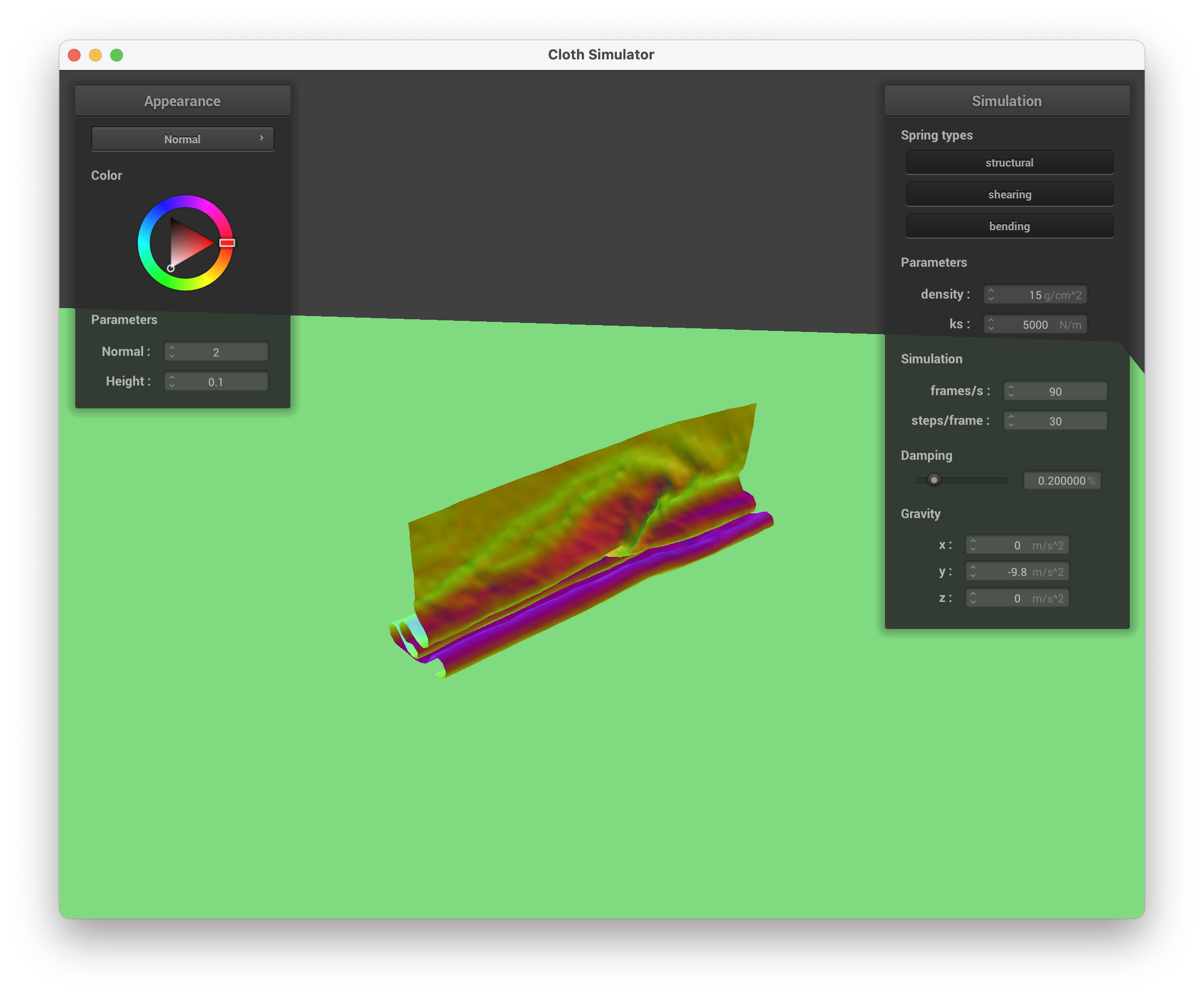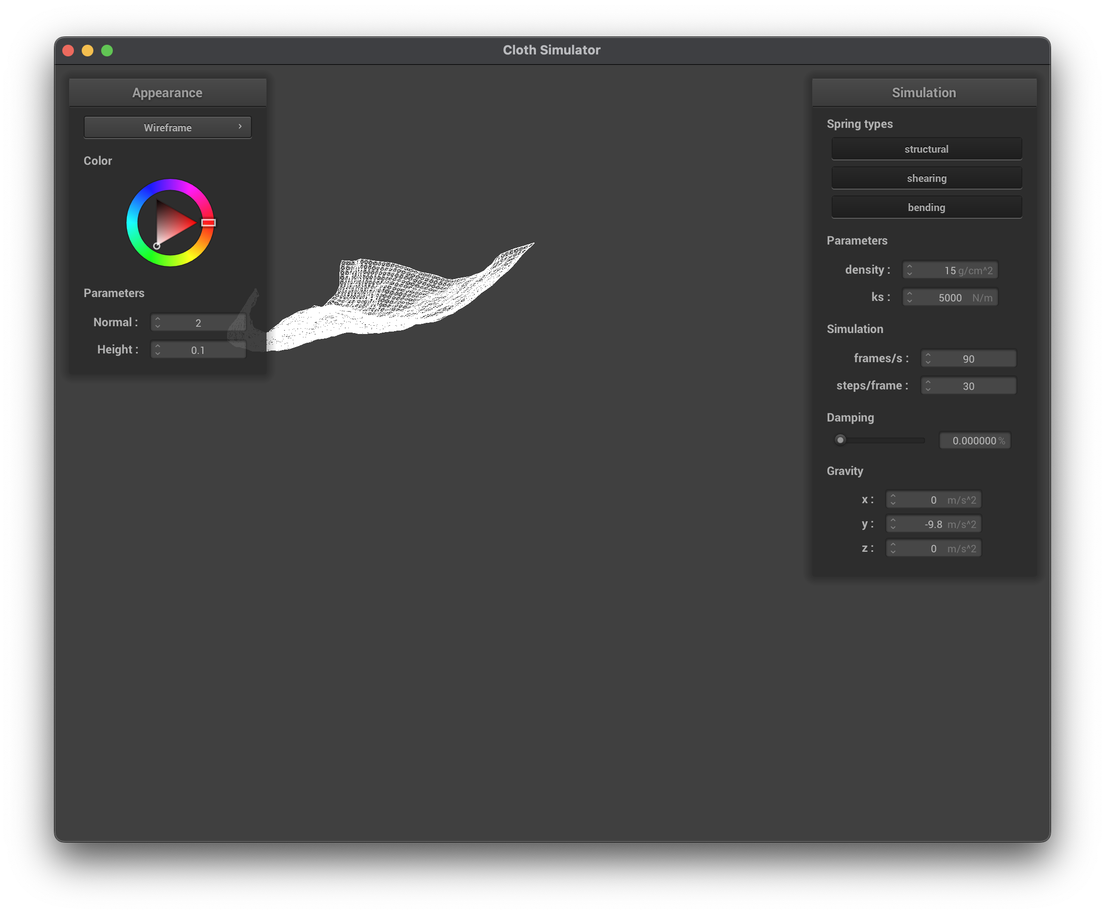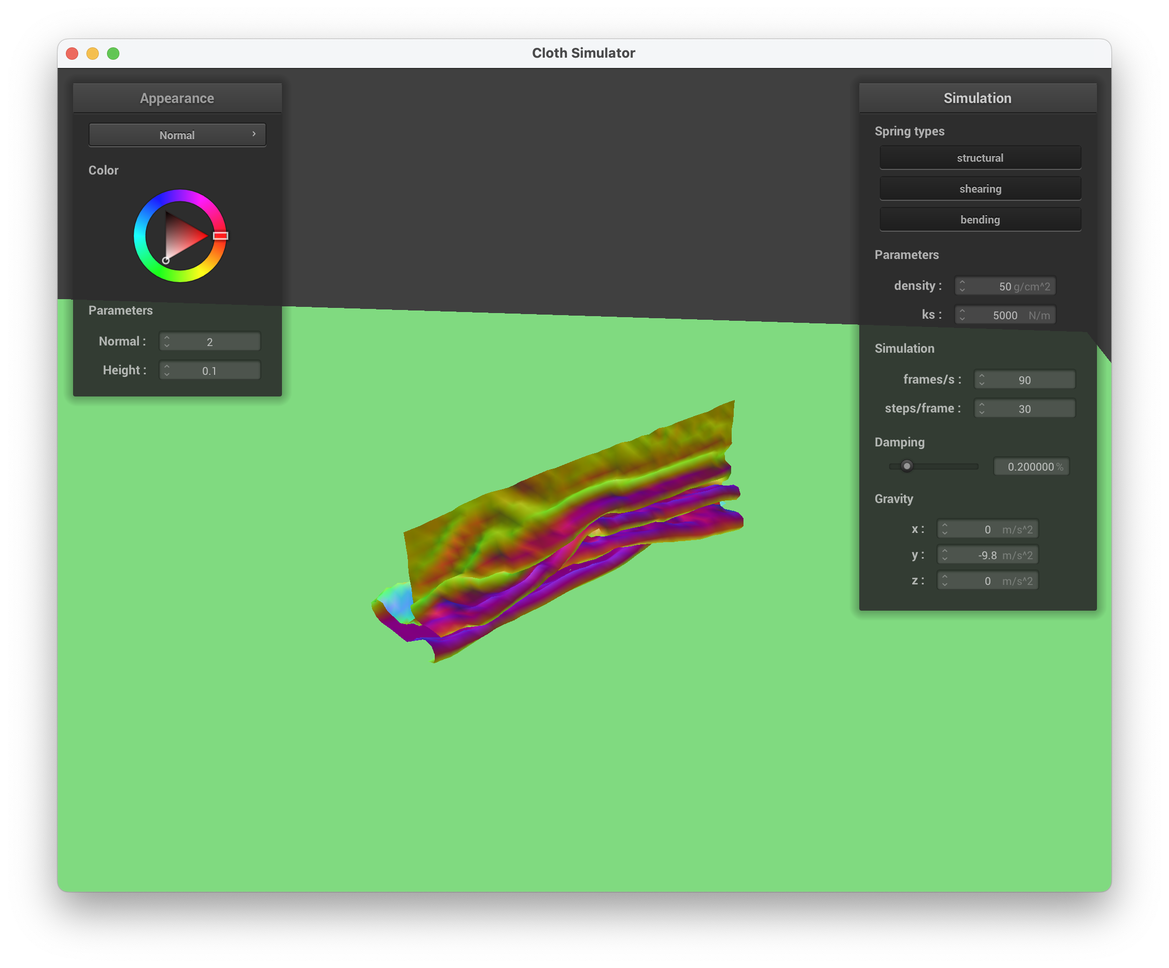 Experiment with some the parameters in the simulation. To do so, pause the simulation at the start with P, modify the values of interest, and then resume by pressing P again. You can also restart the simulation at any time from the cloth's starting position by pressing R.
