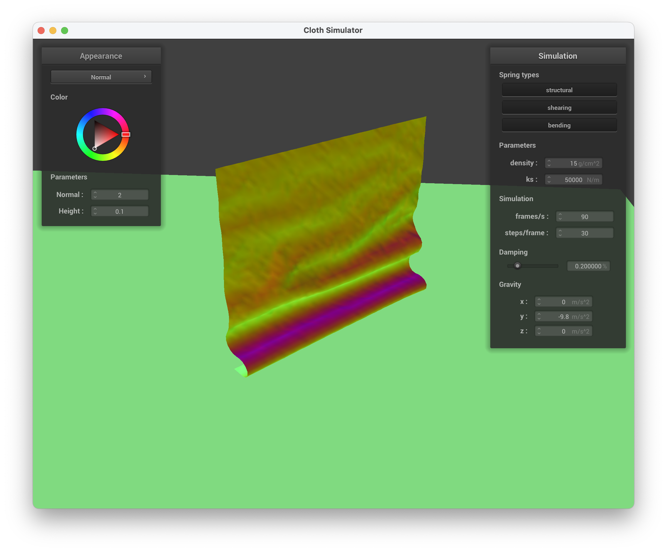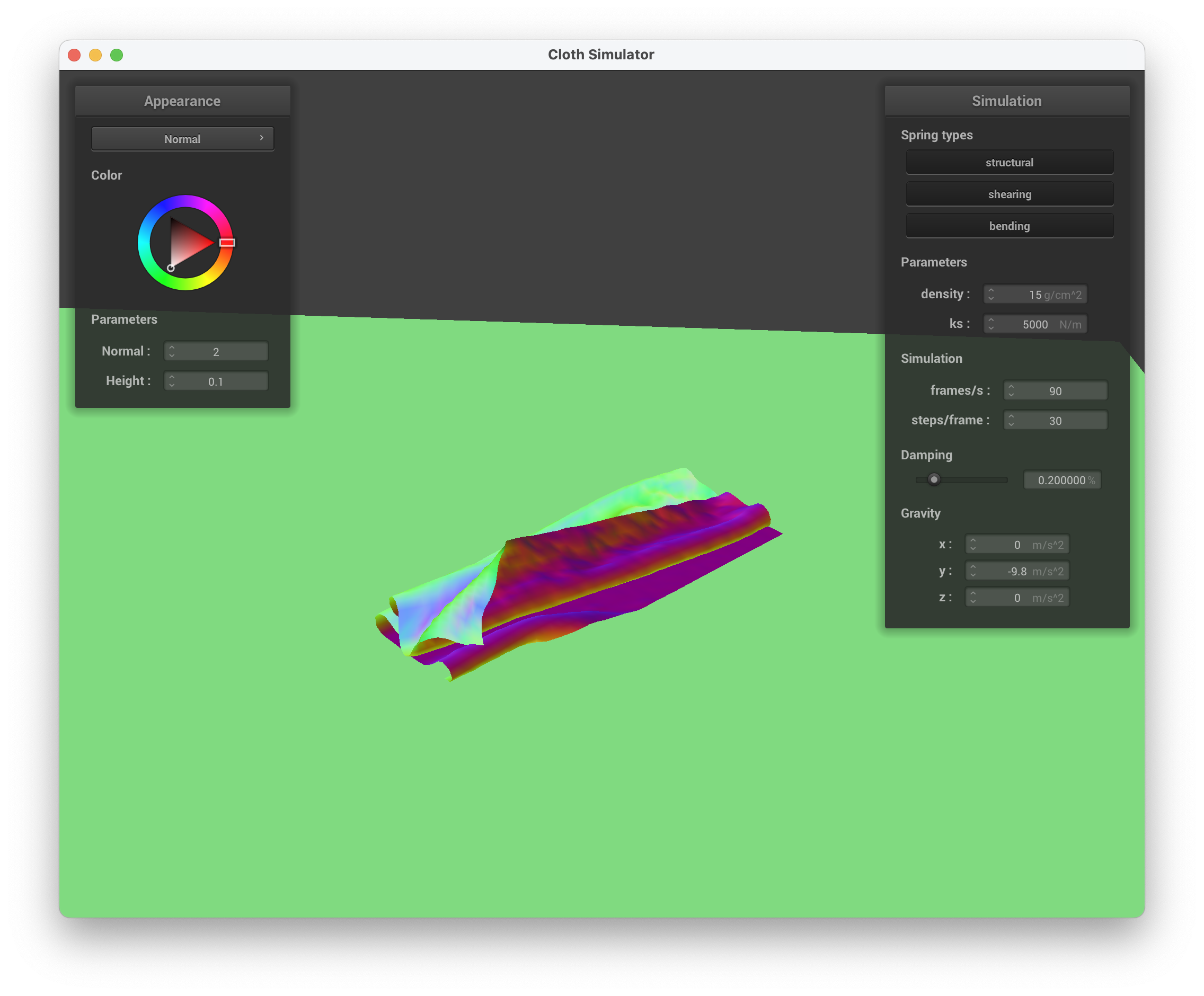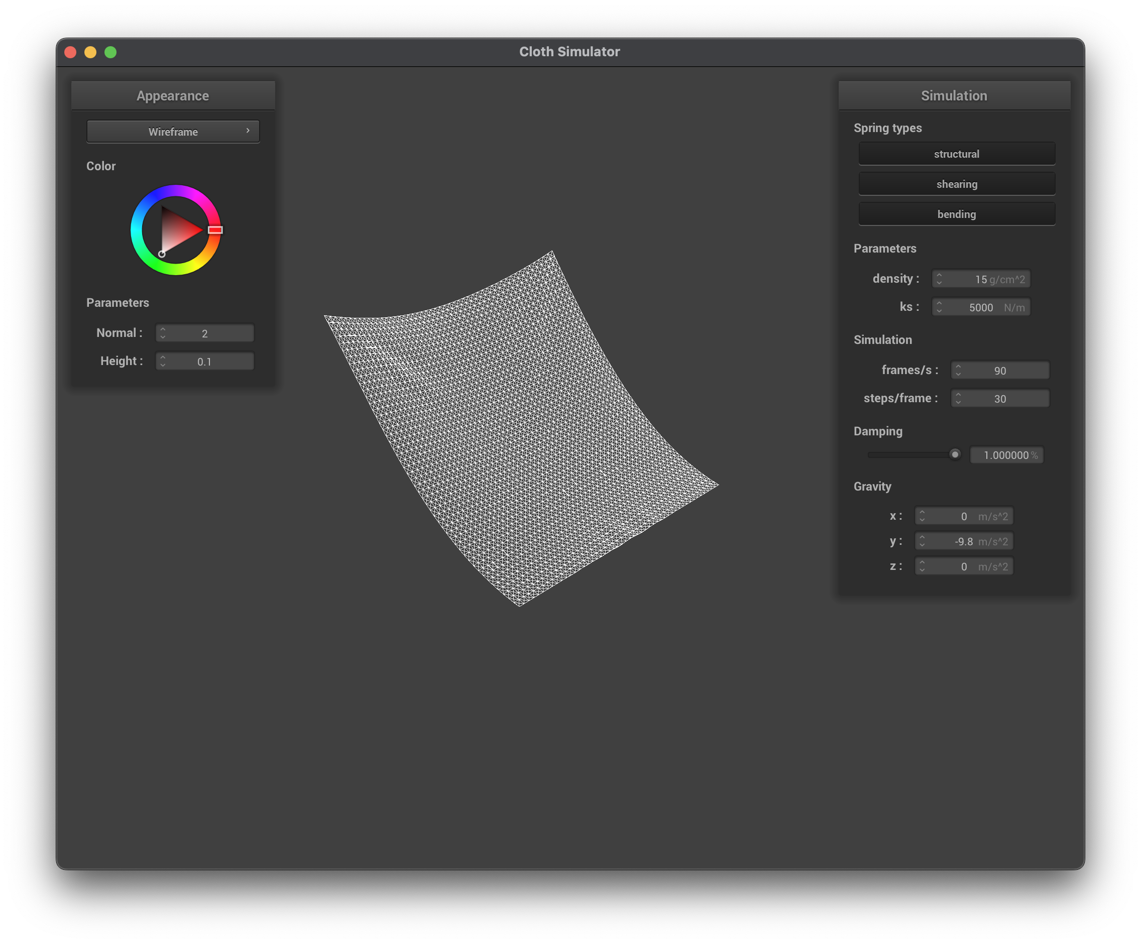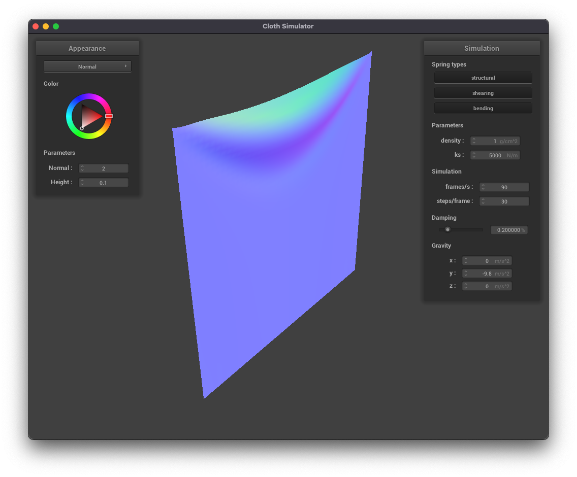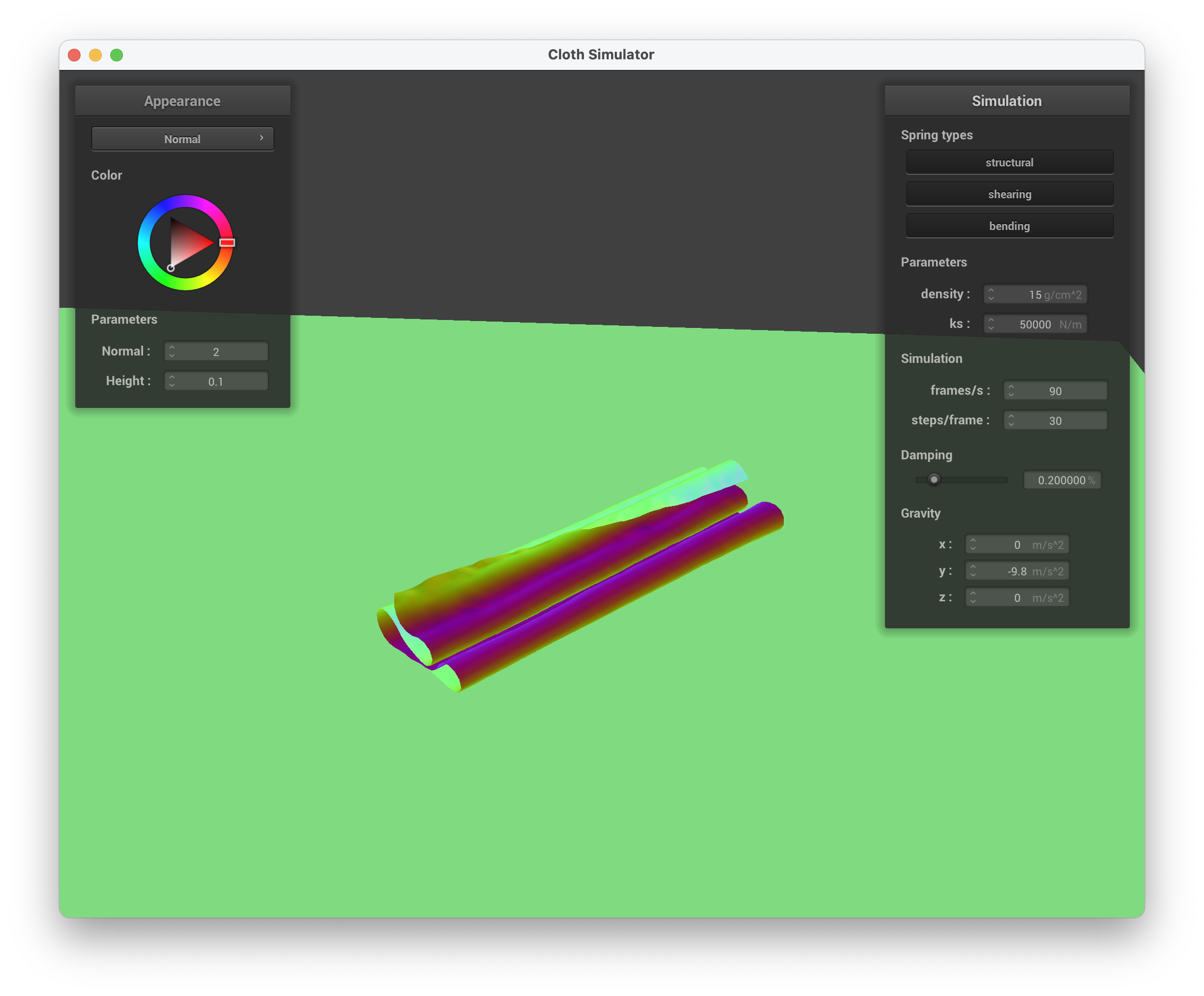 Experiment with some the parameters in the simulation. To do so, pause the simulation at the start with P, modify the values of interest, and then resume by pressing P again. You can also restart the simulation at any time from the cloth's starting position by pressing R.