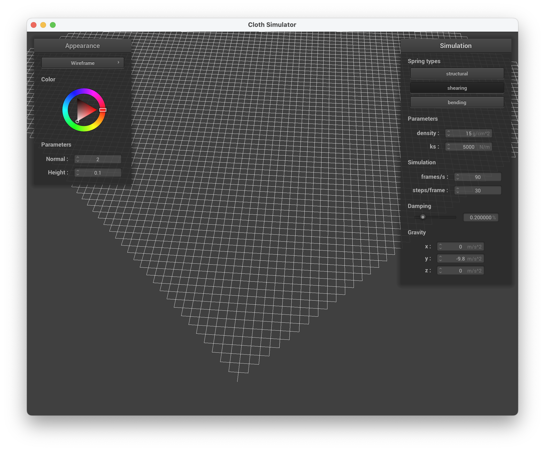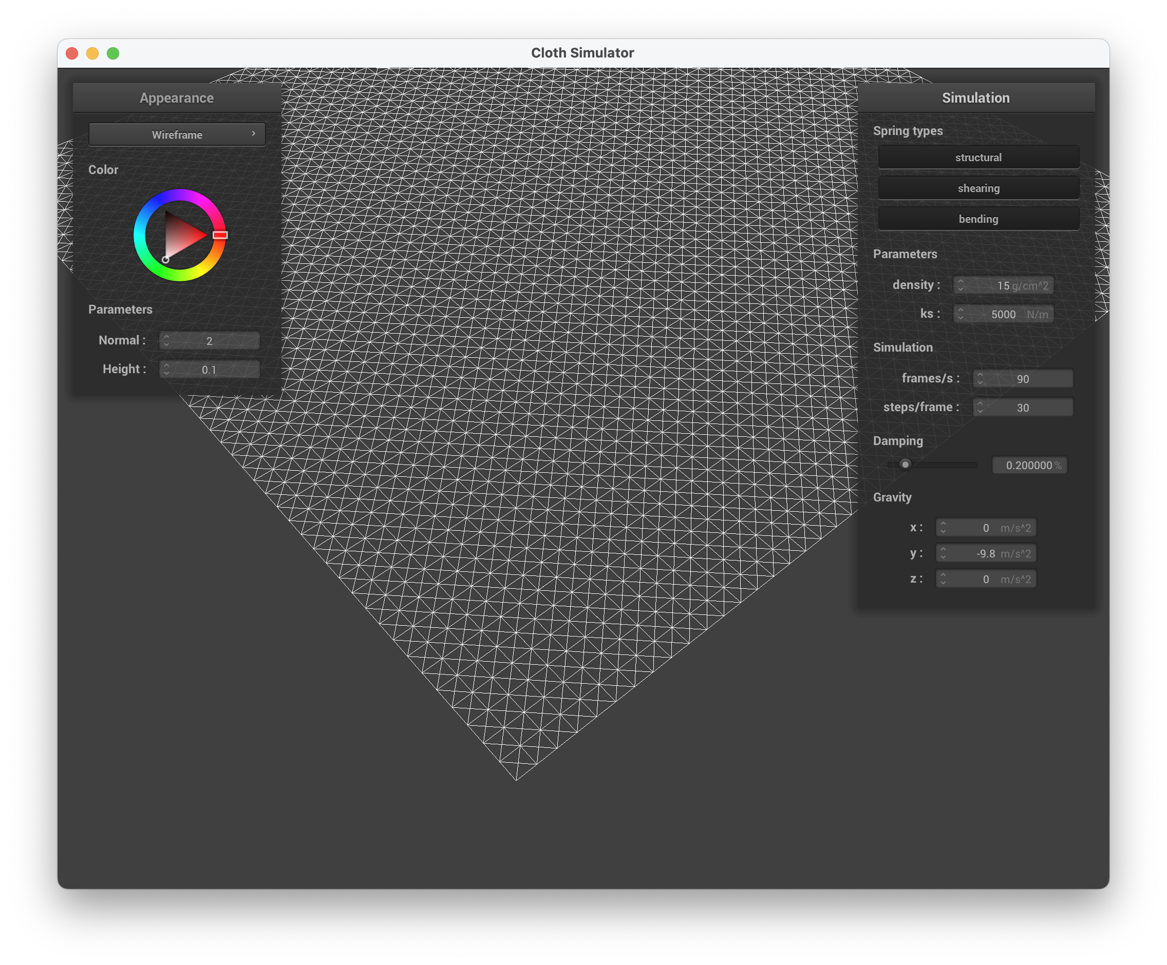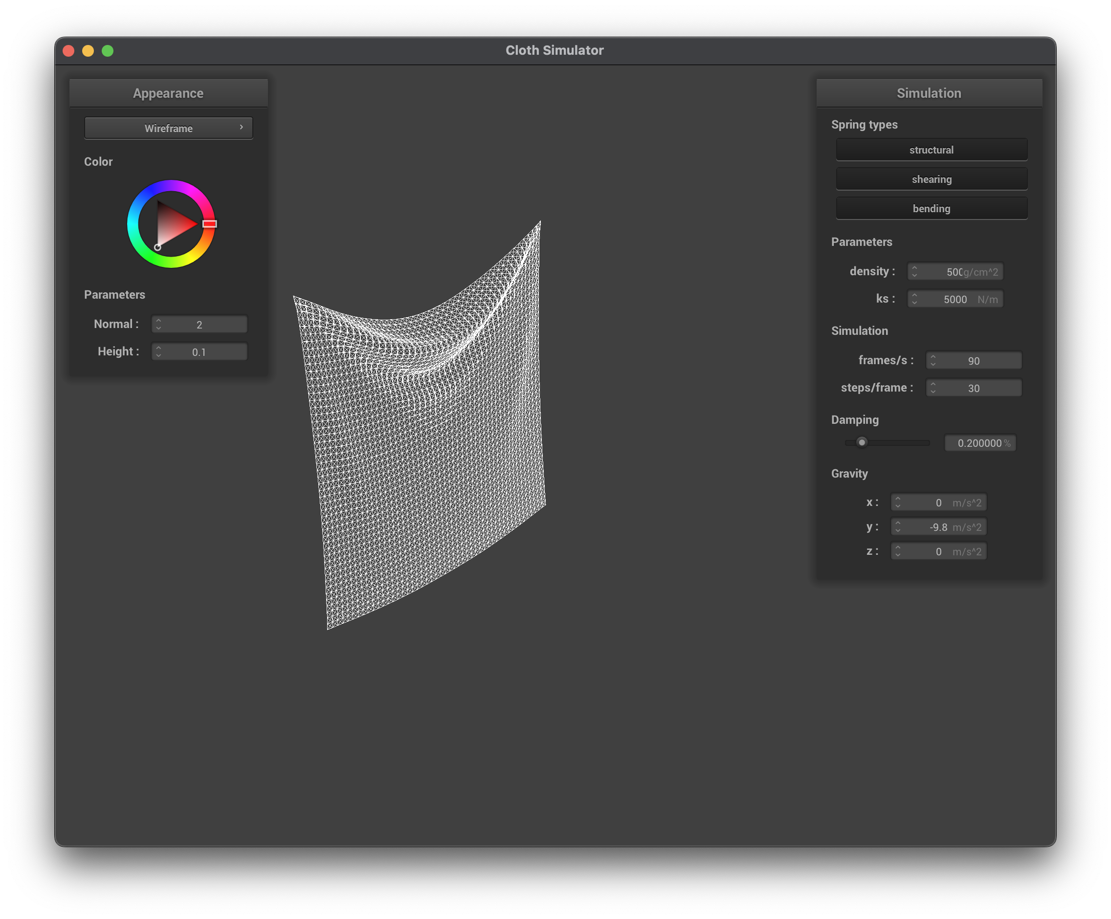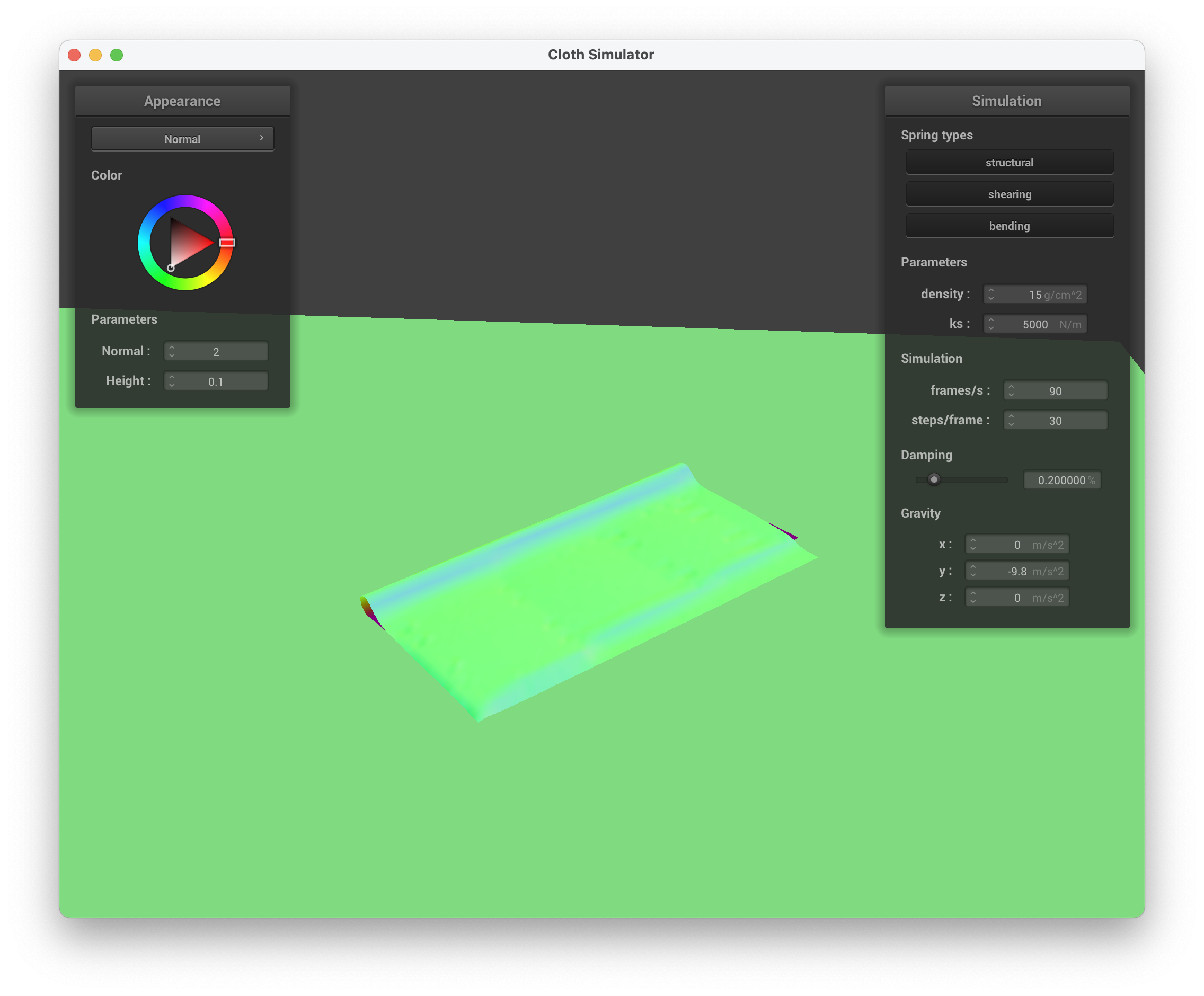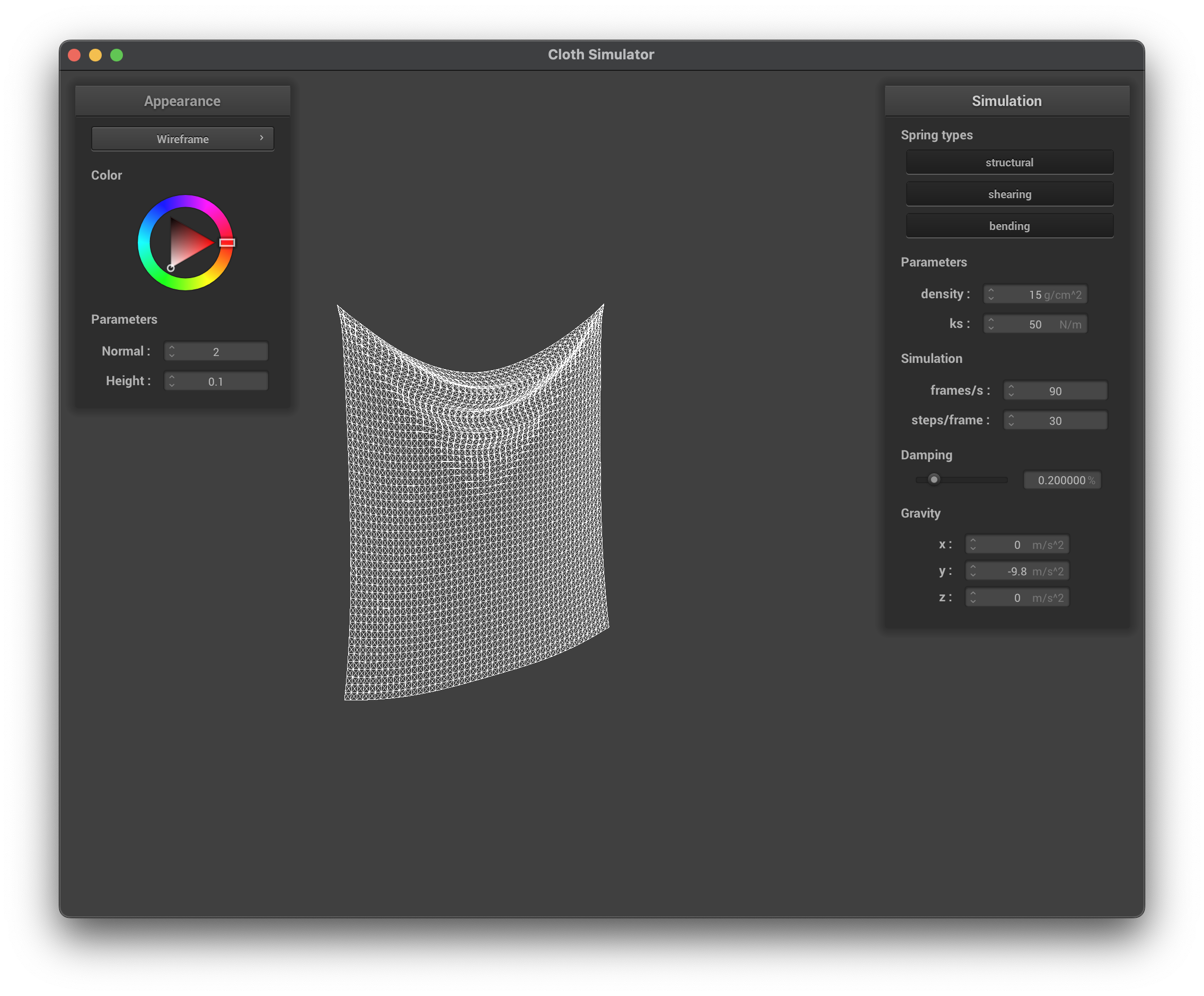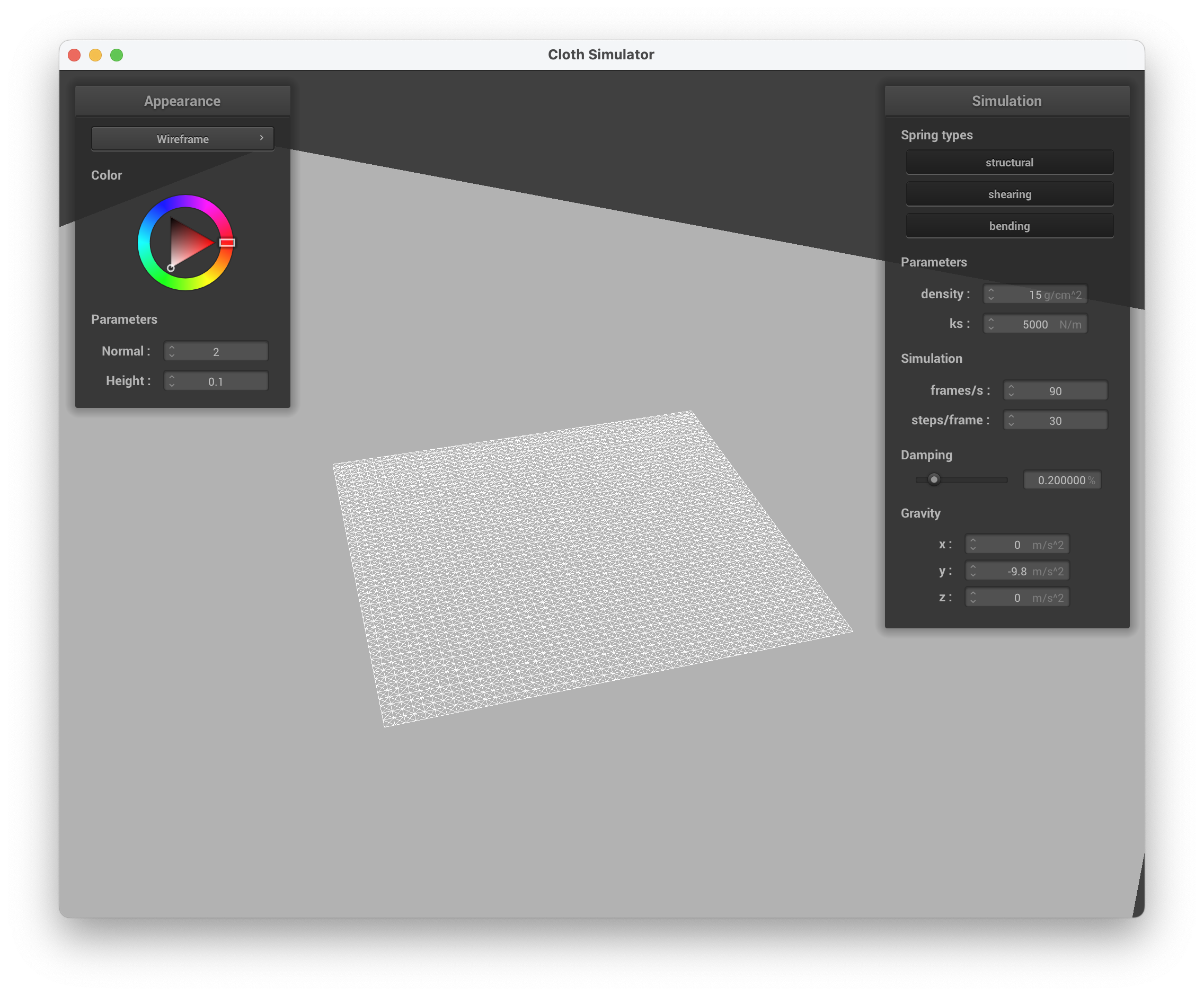 Experiment with some the parameters in the simulation. To do so, pause the simulation at the start with P, modify the values of interest, and then resume by pressing P again. You can also restart the simulation at any time from the cloth's starting position by pressing R.