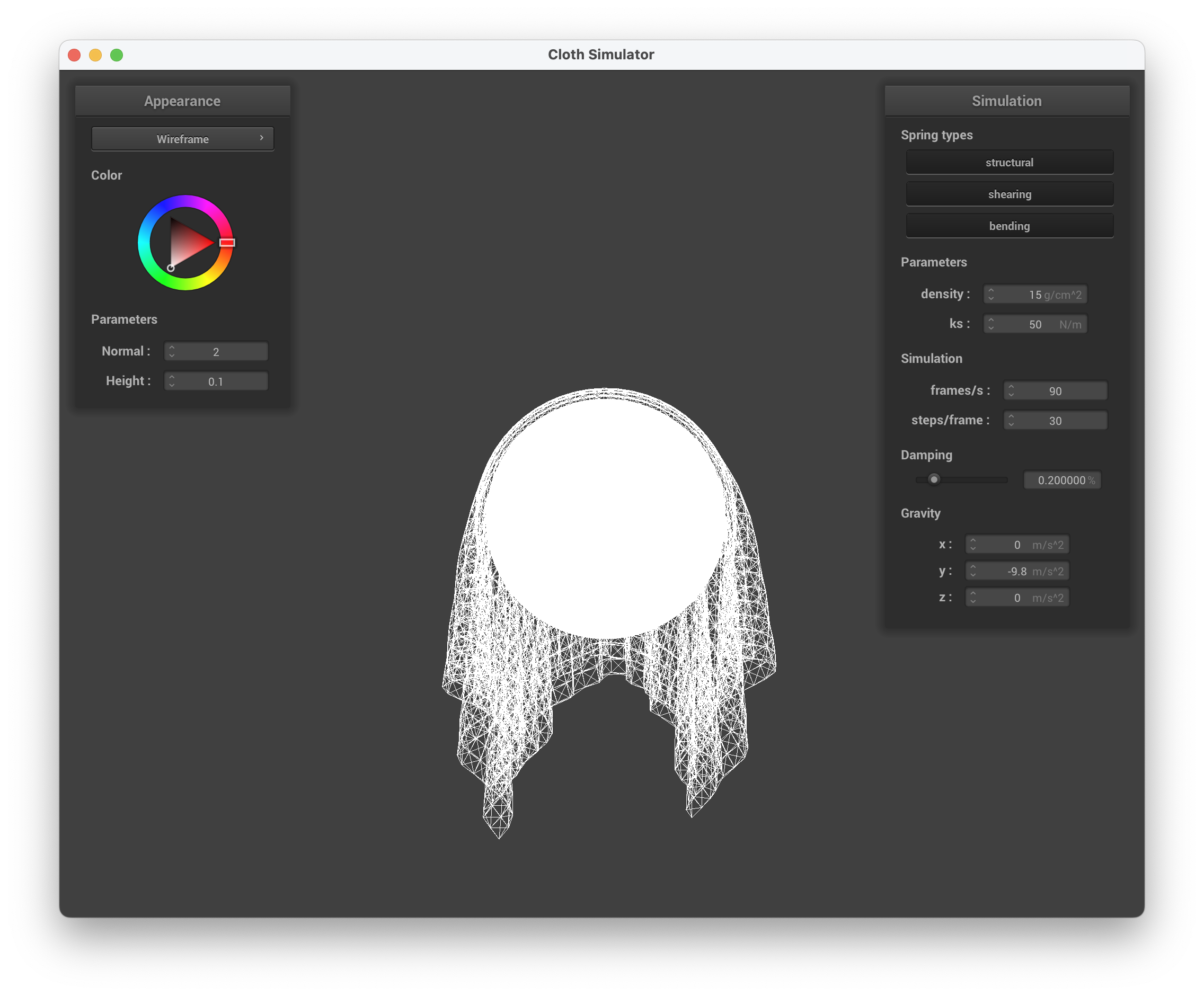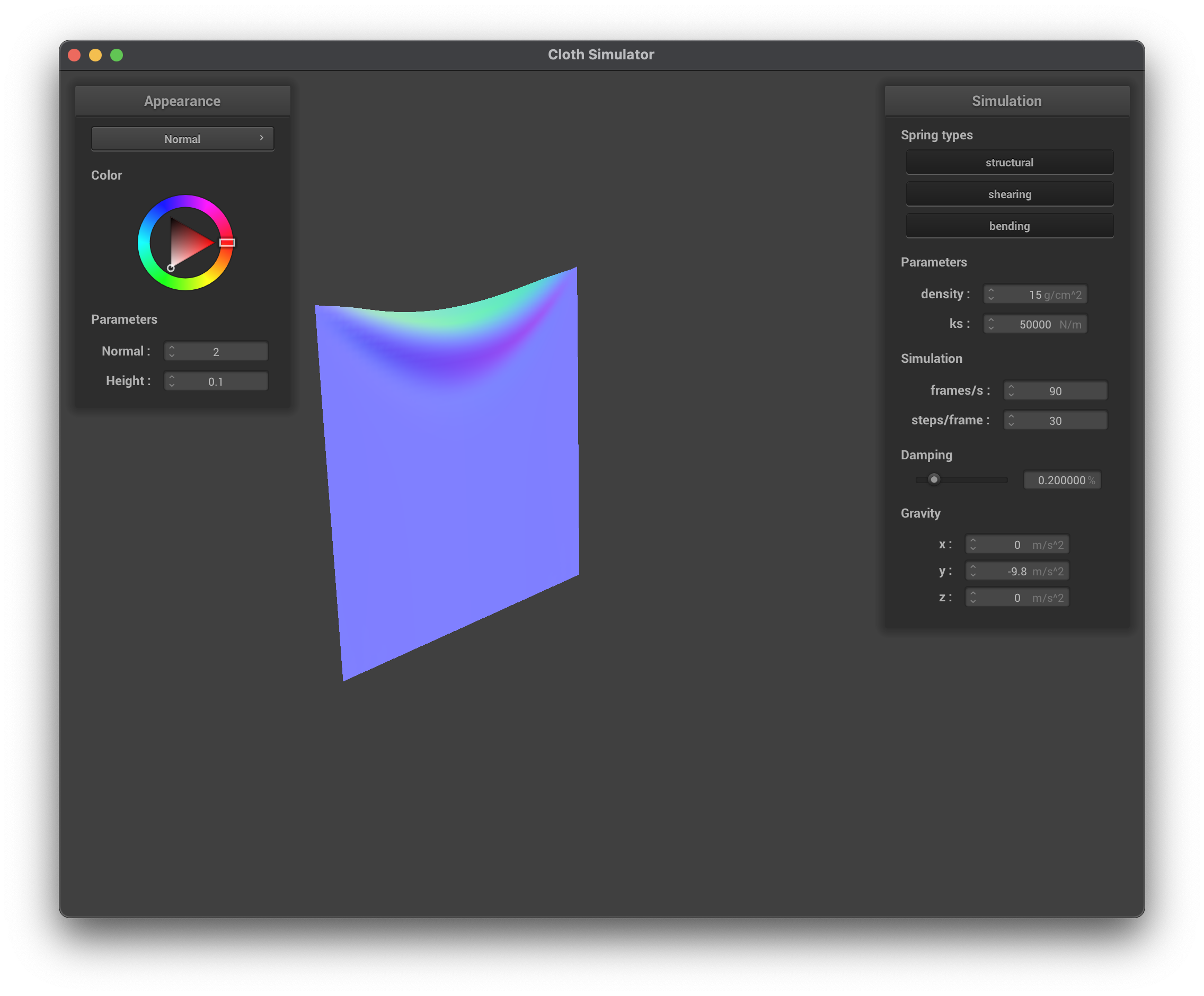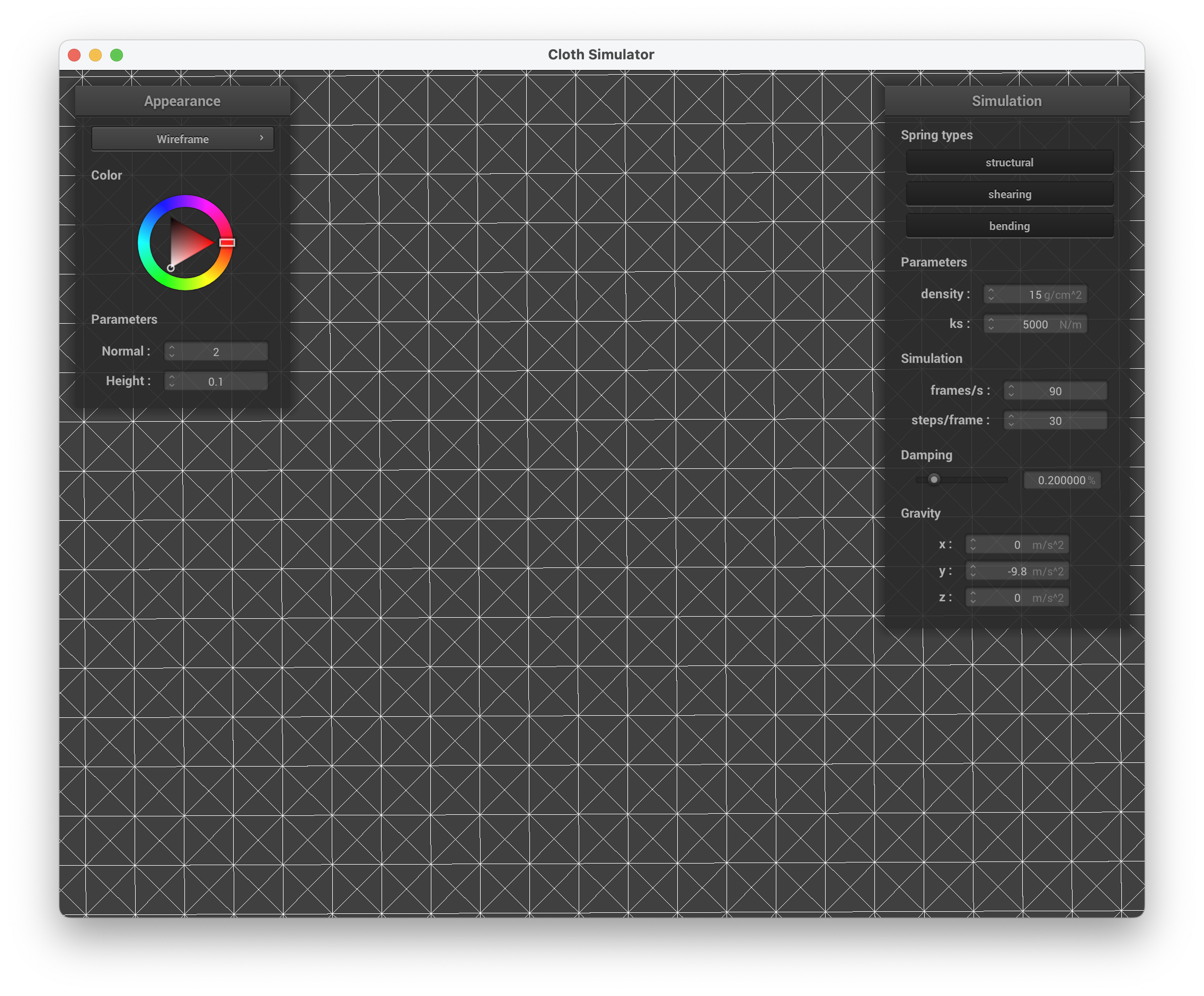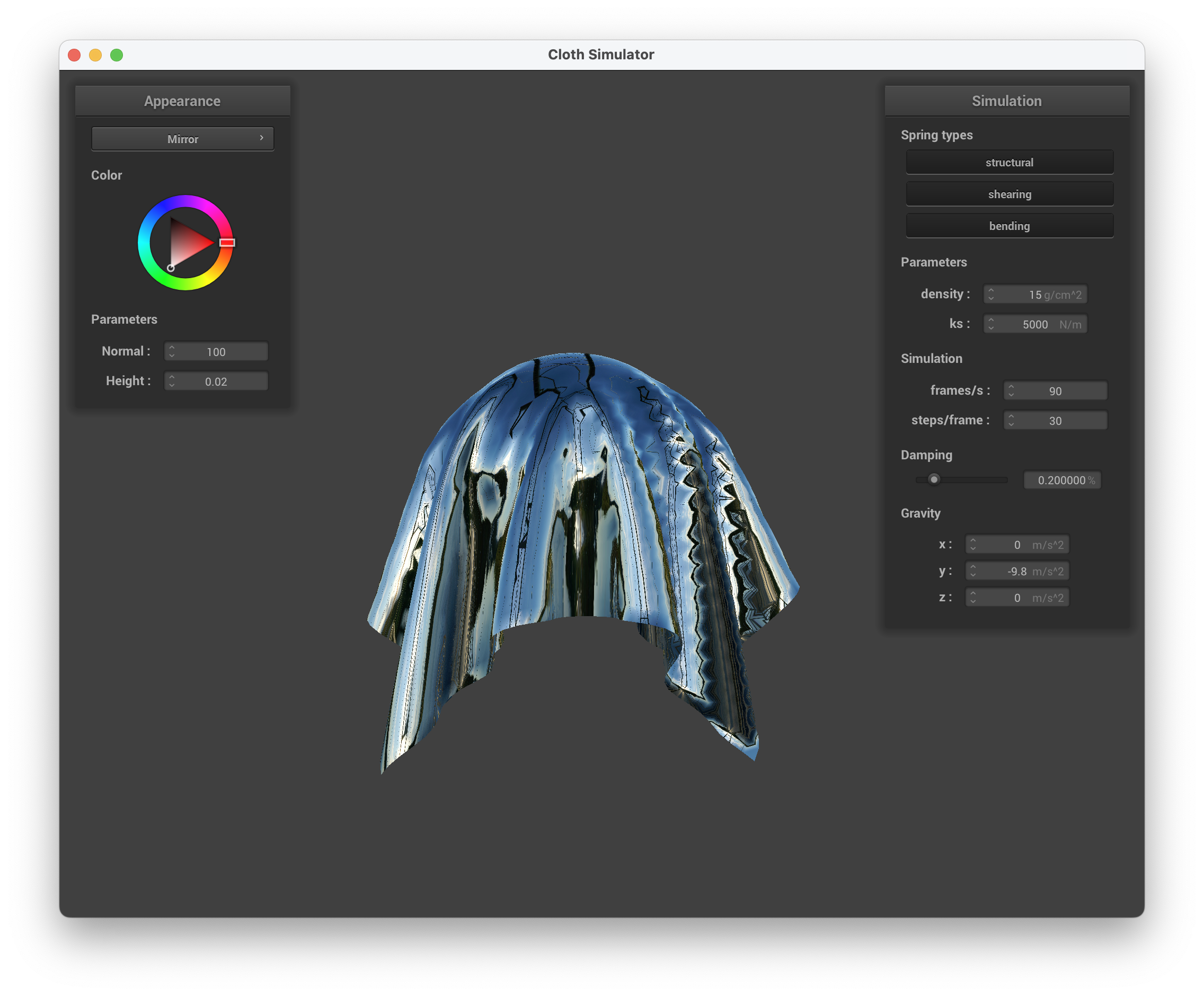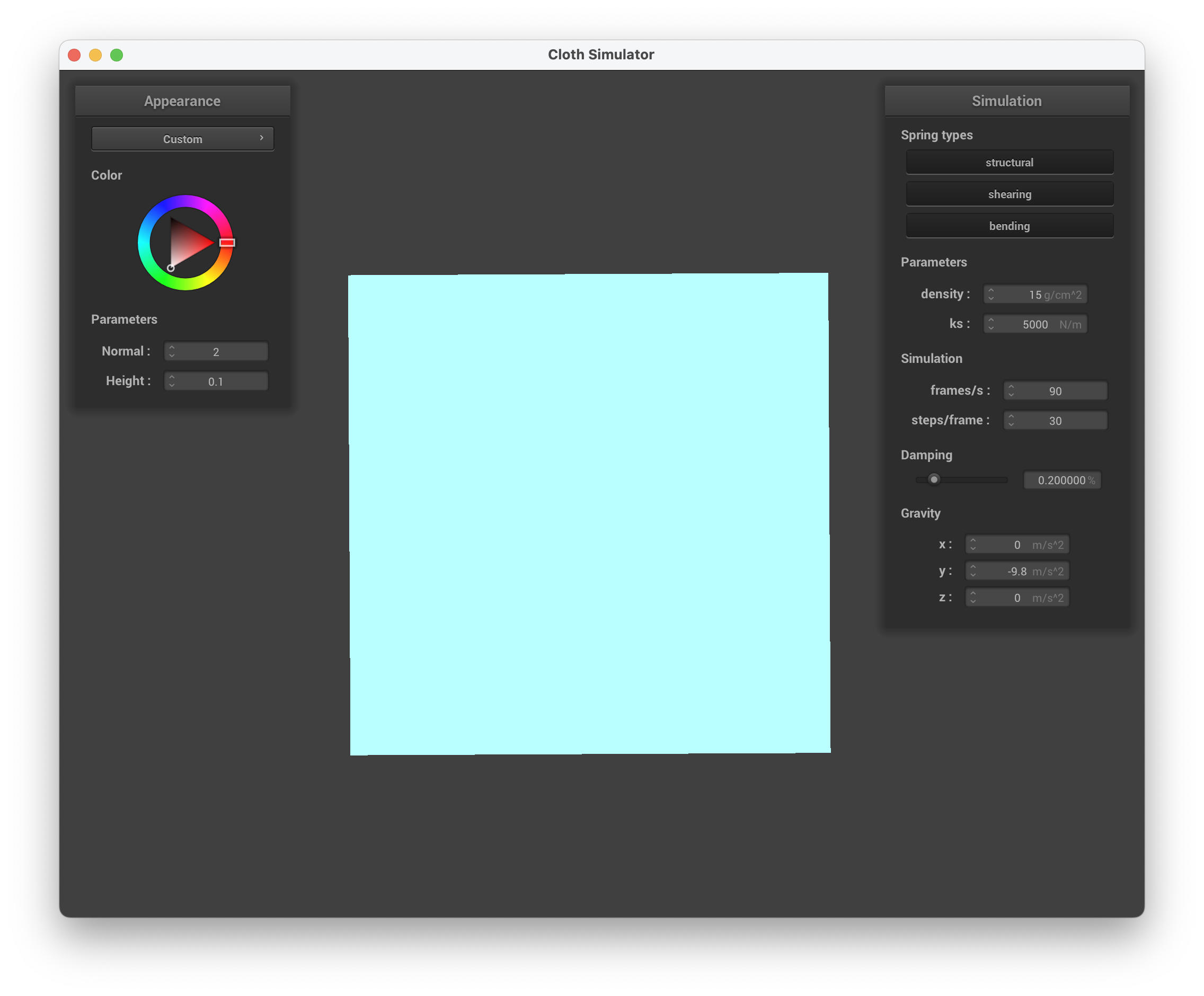 Experiment with some the parameters in the simulation. To do so, pause the simulation at the start with P, modify the values of interest, and then resume by pressing P again. You can also restart the simulation at any time from the cloth's starting position by pressing R.