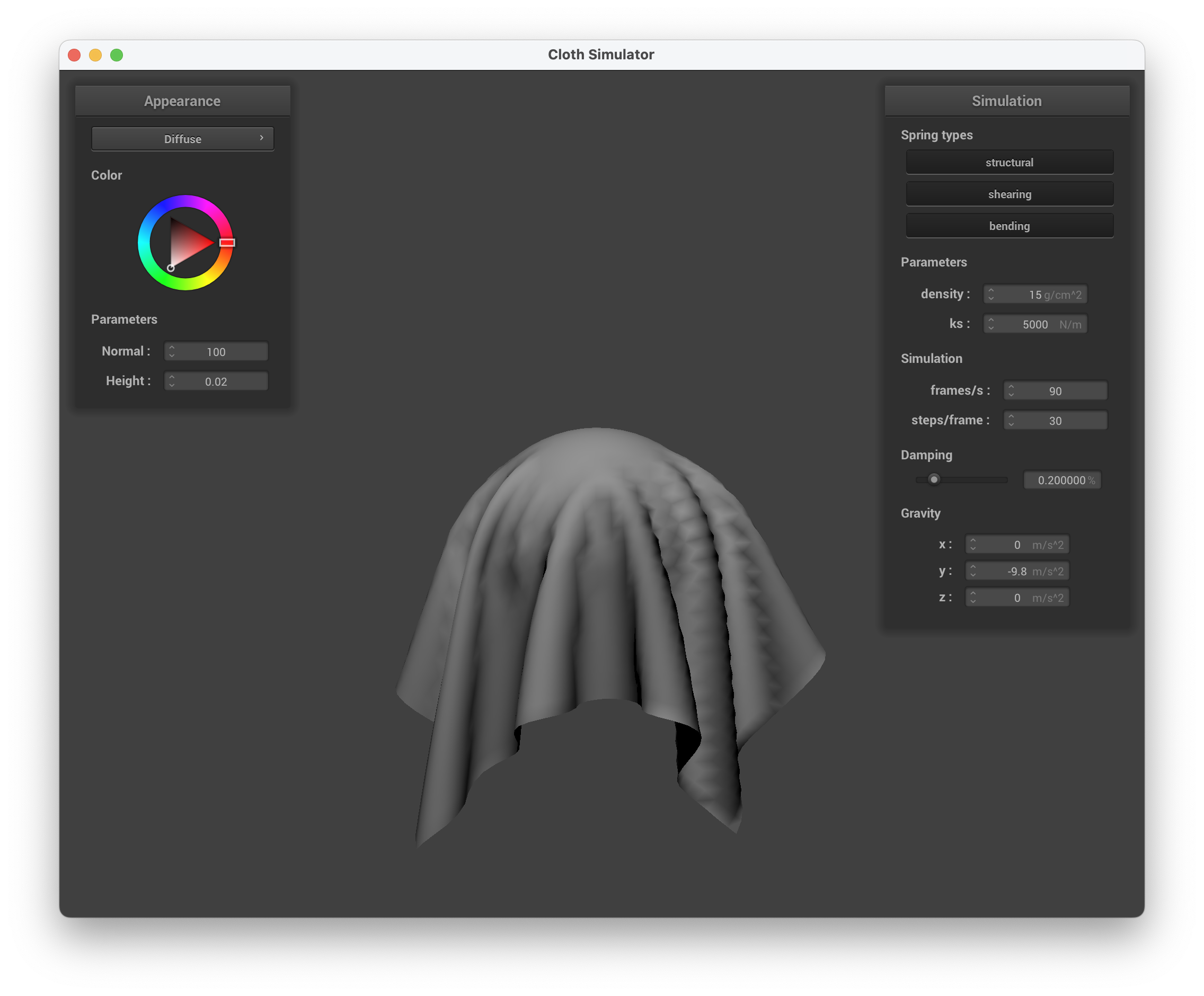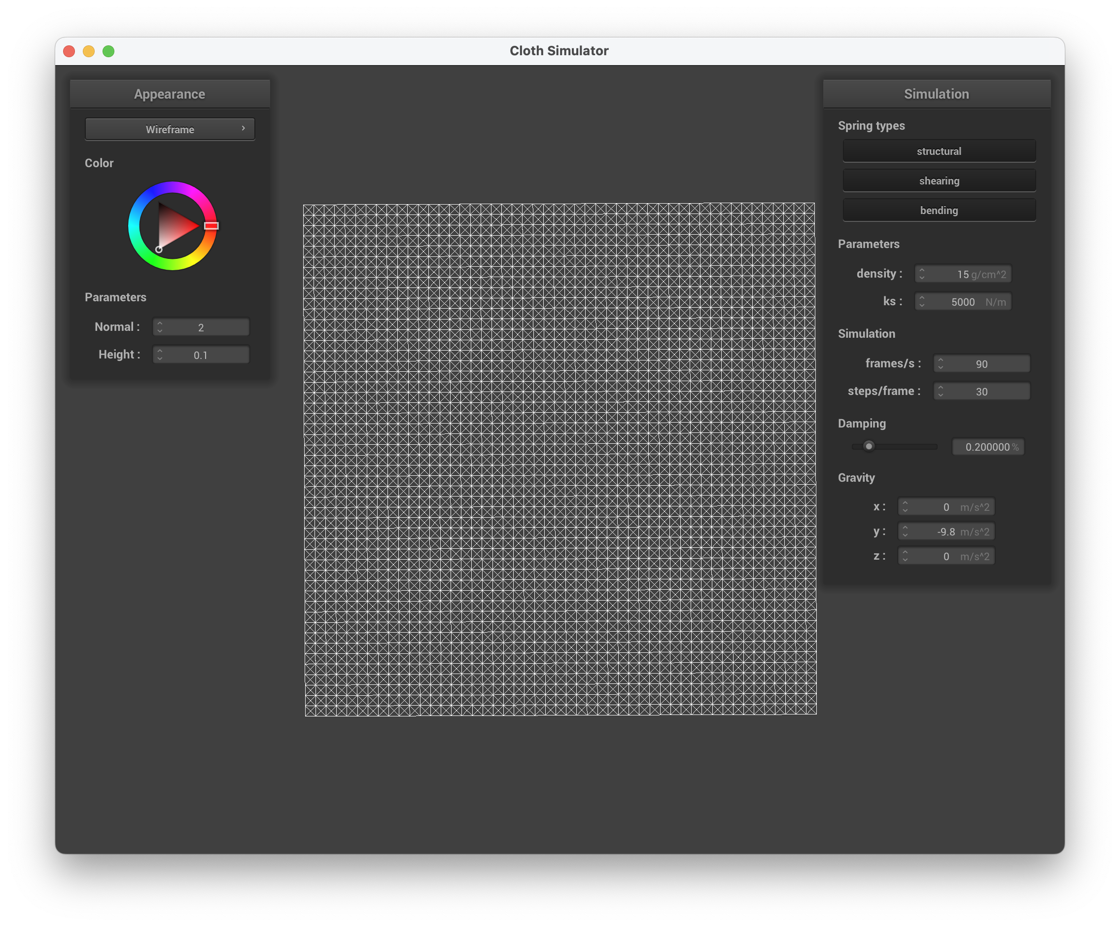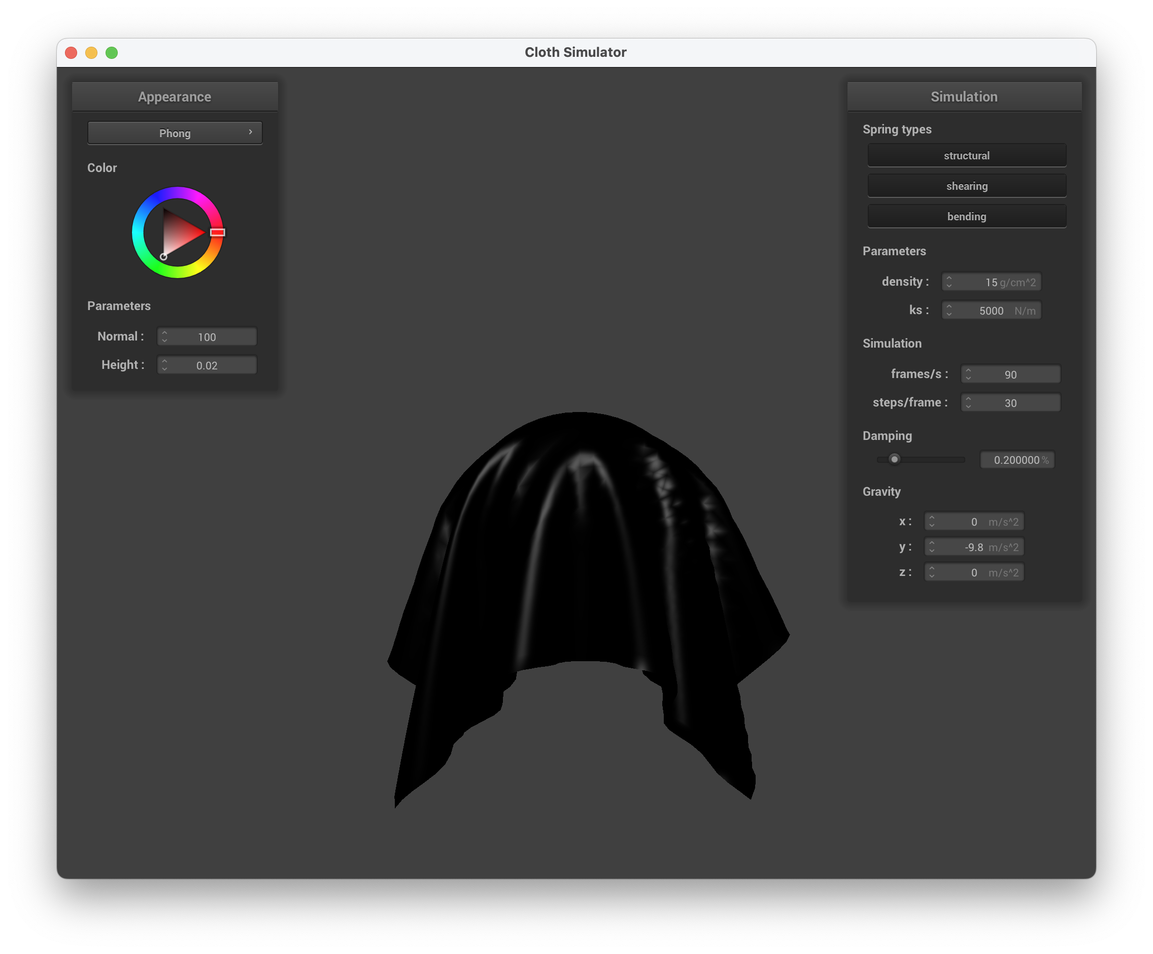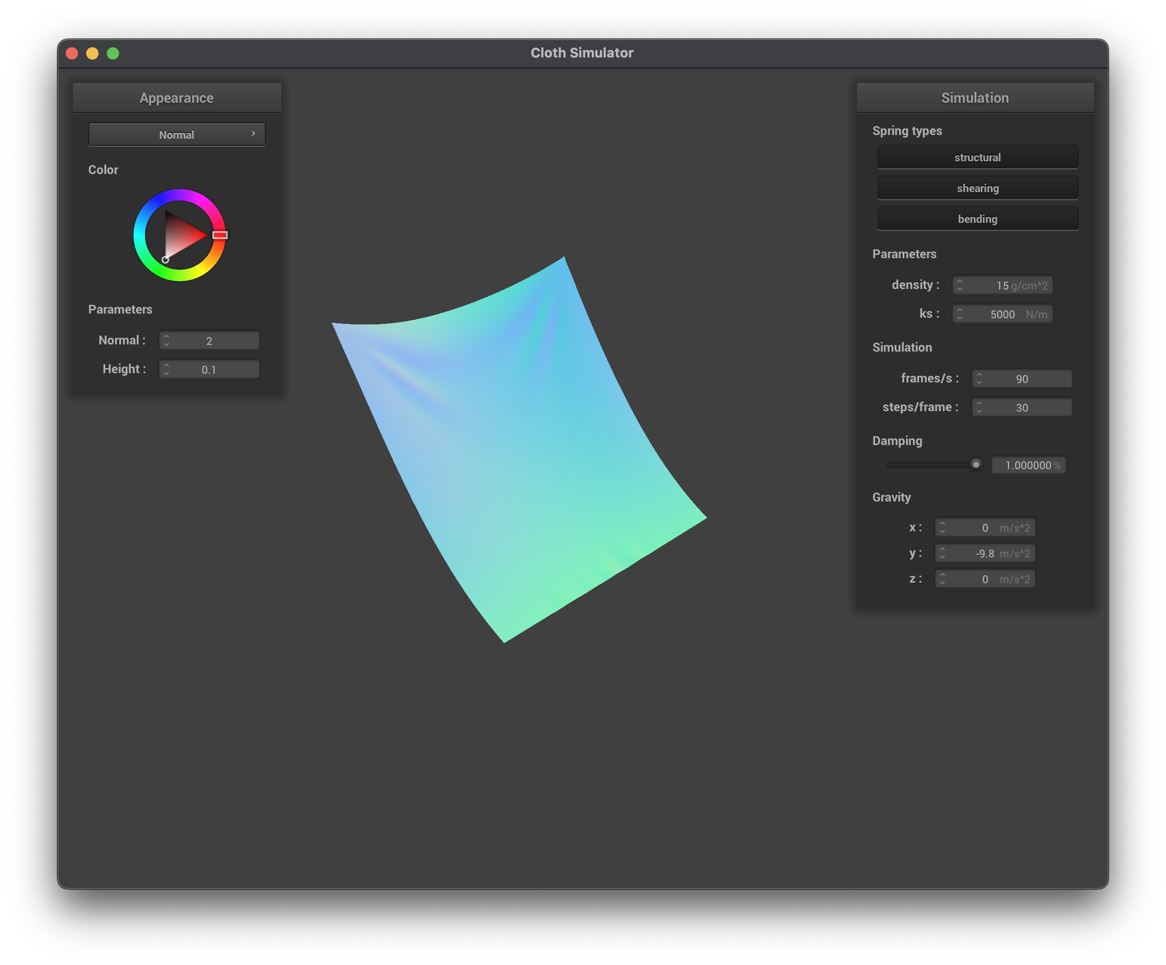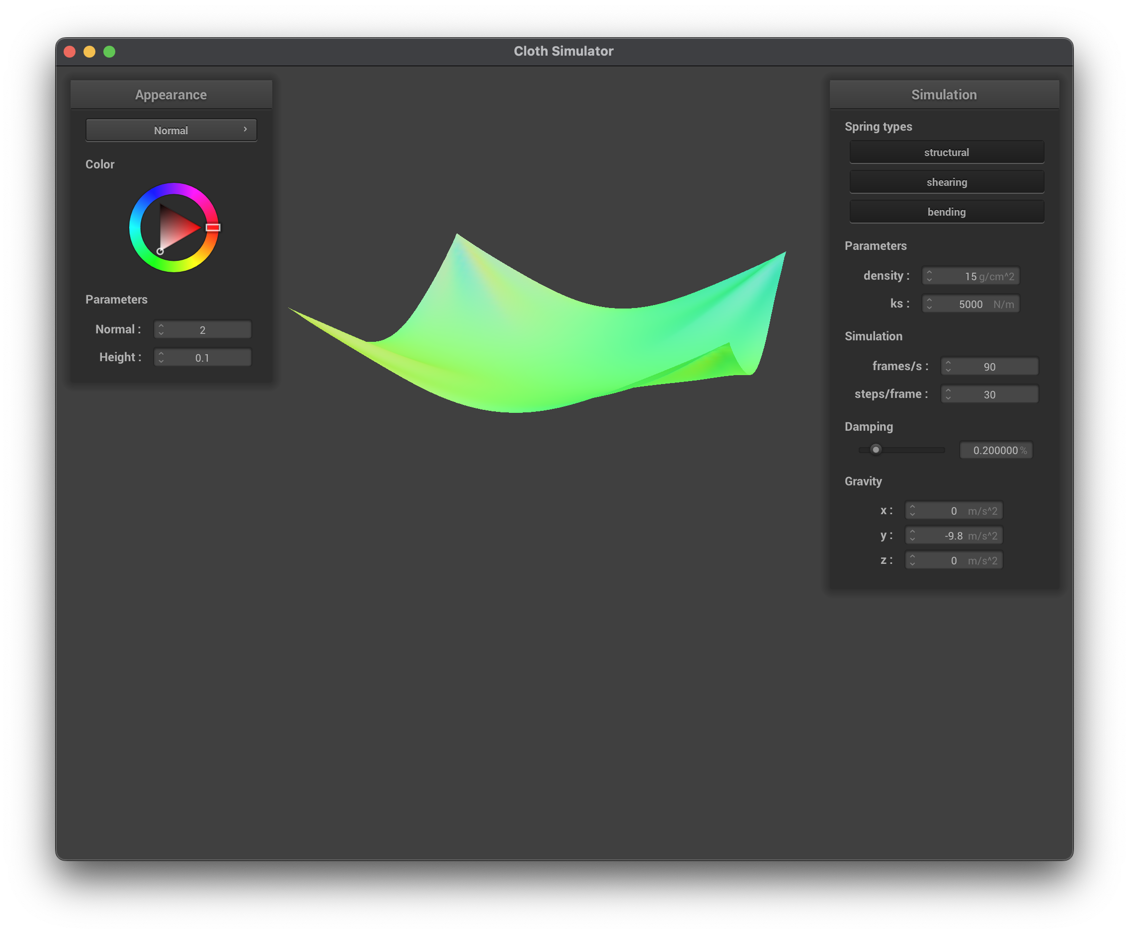 Experiment with some the parameters in the simulation. To do so, pause the simulation at the start with P, modify the values of interest, and then resume by pressing P again. You can also restart the simulation at any time from the cloth's starting position by pressing R.