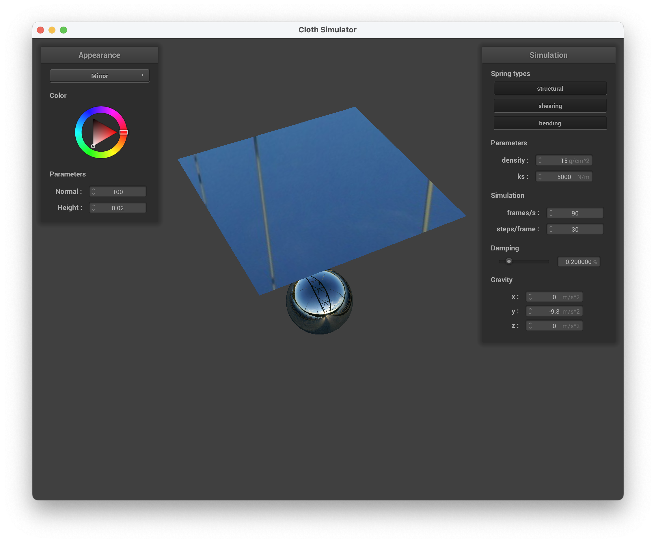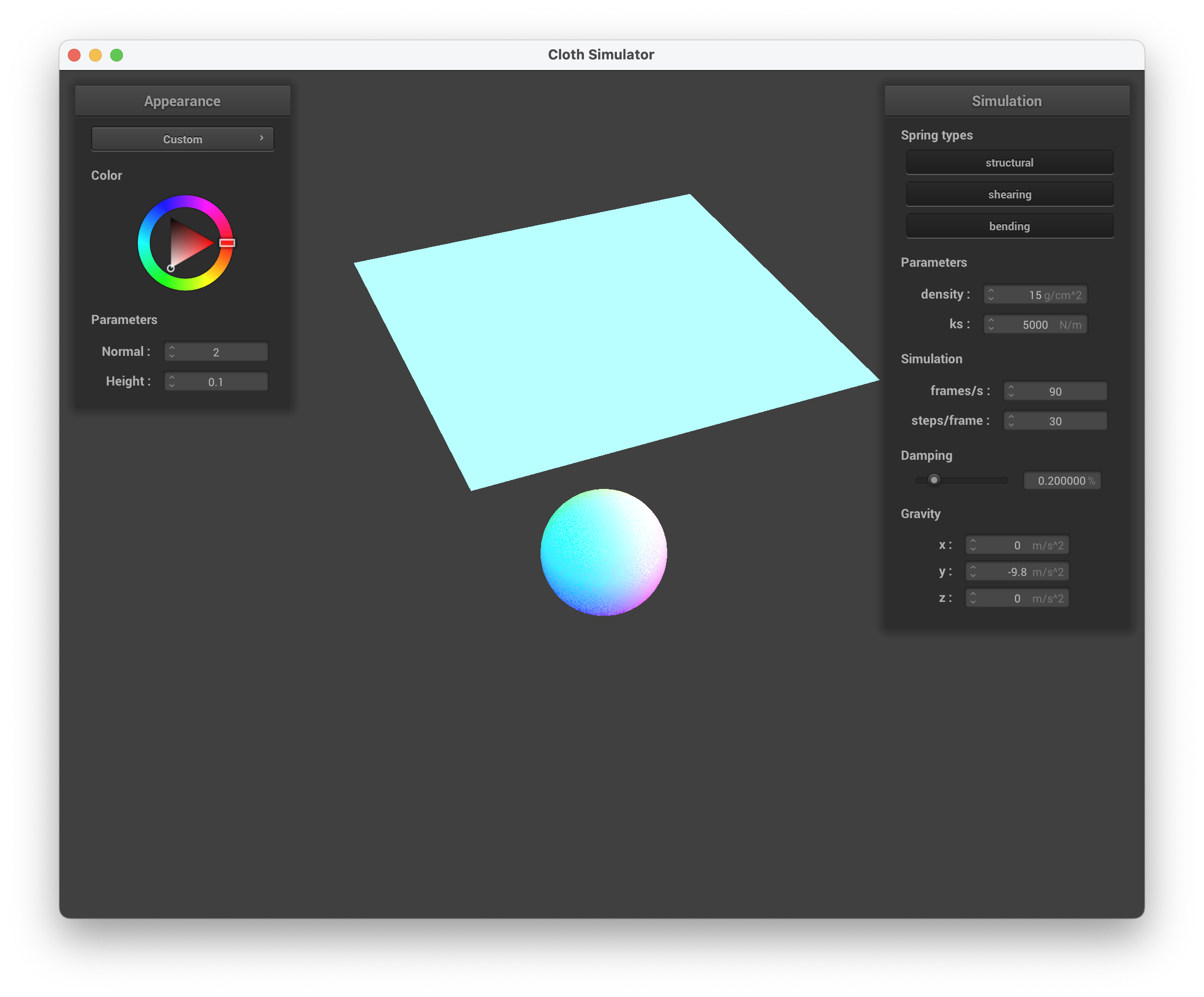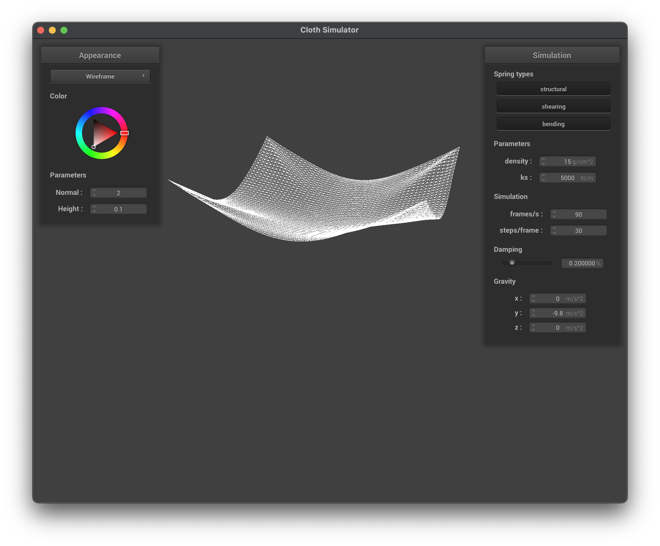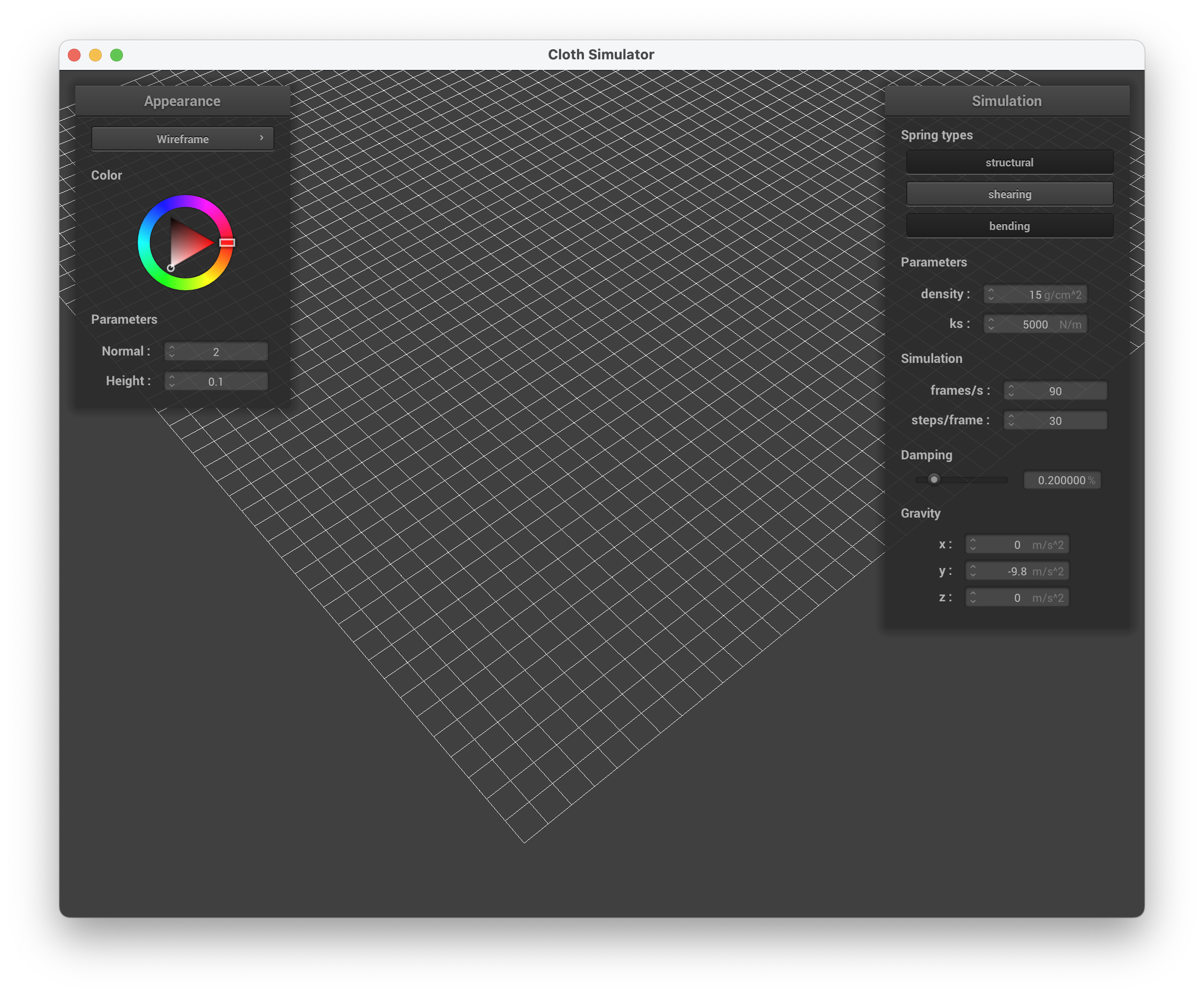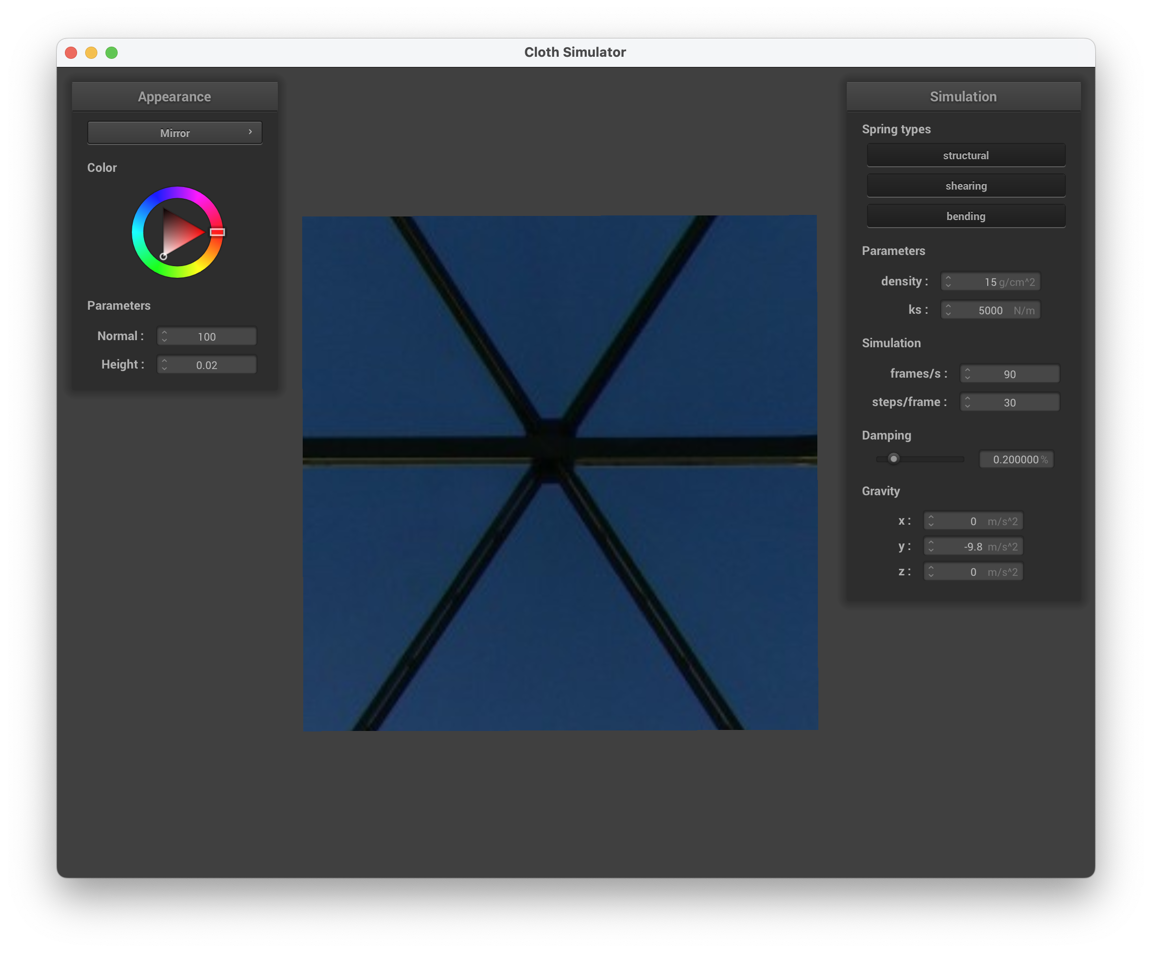 Experiment with some the parameters in the simulation. To do so, pause the simulation at the start with P, modify the values of interest, and then resume by pressing P again. You can also restart the simulation at any time from the cloth's starting position by pressing R.