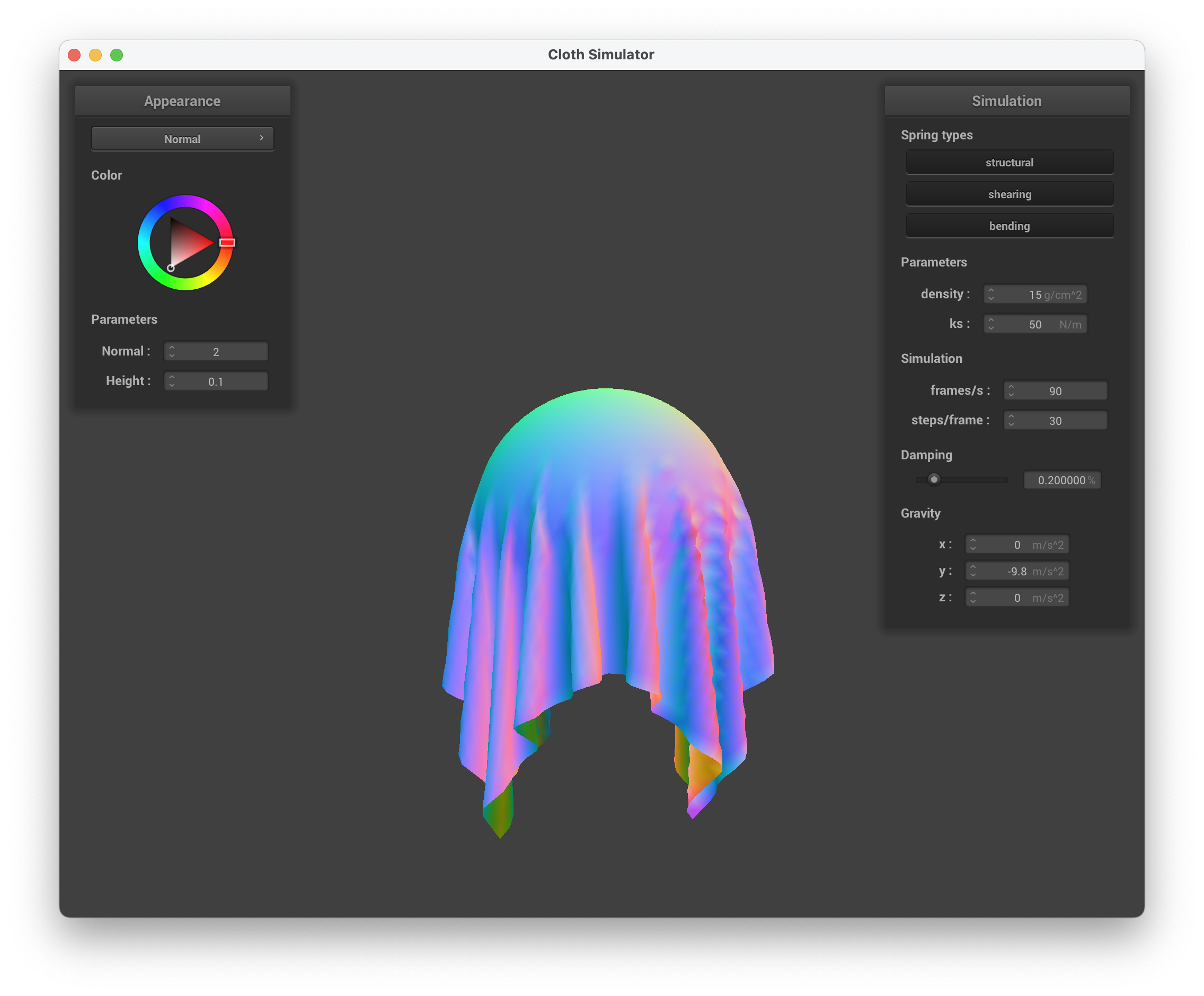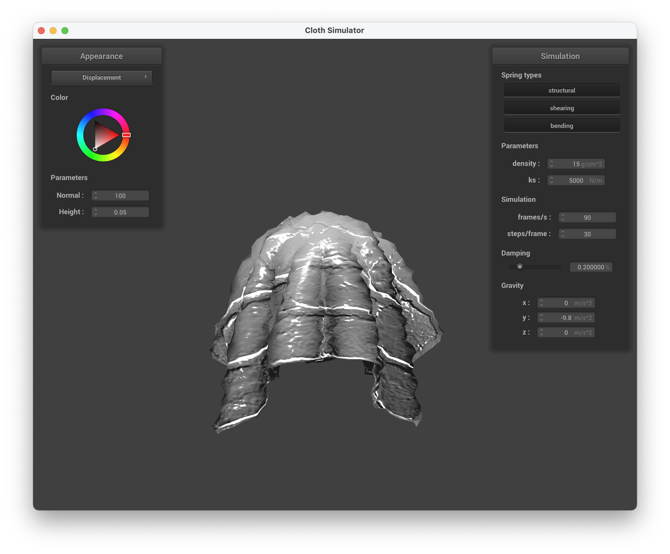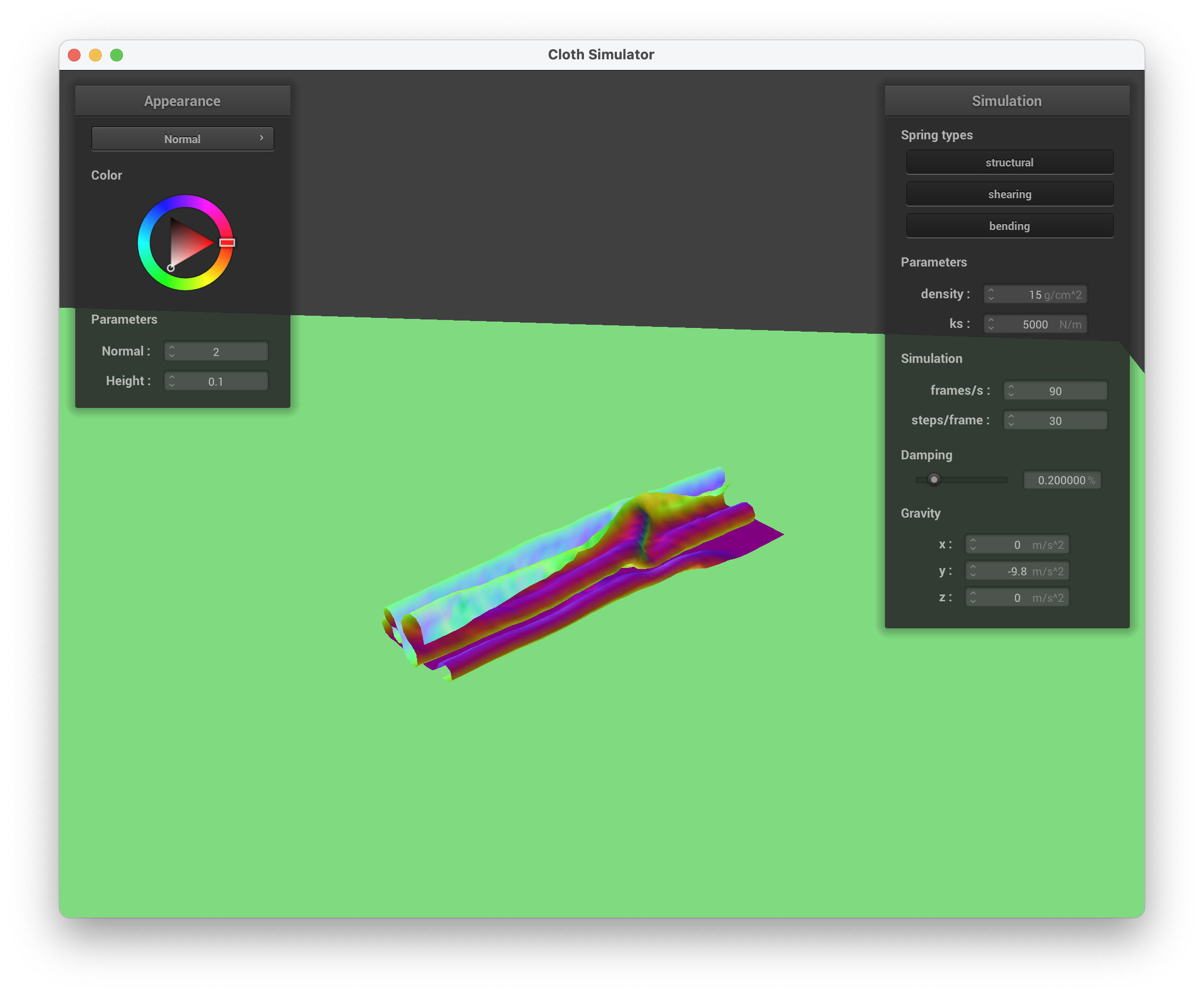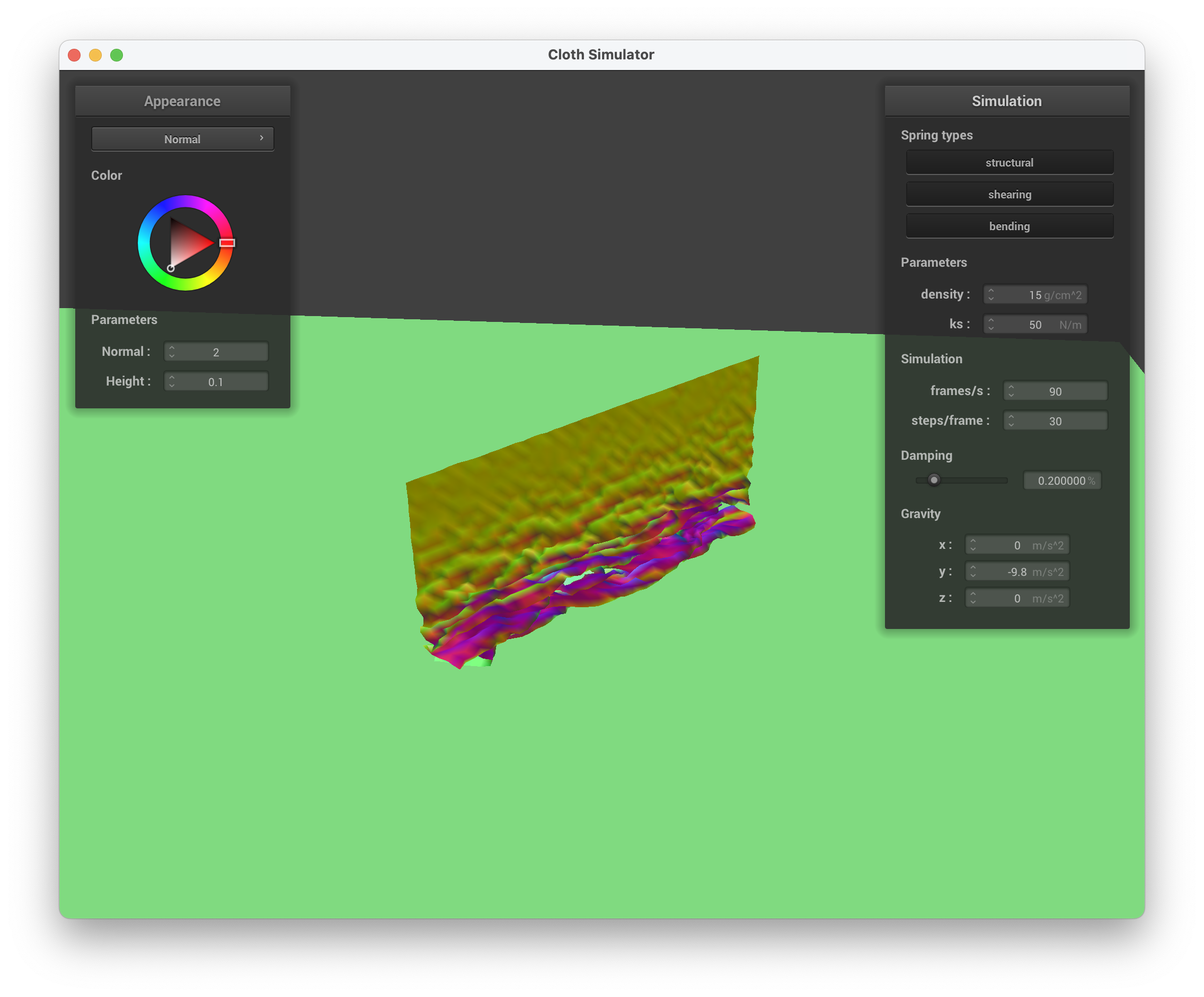 To help keep springs from being unreasonably deformed during each time step, we implemented an additional feature based on the SIGGRAPH 1995 Provot paper on deformation constraints in mass-spring models. For each spring, we applied this constraint to prevent springs from extending more than 10% greater than its rest_length at the end of any time step.