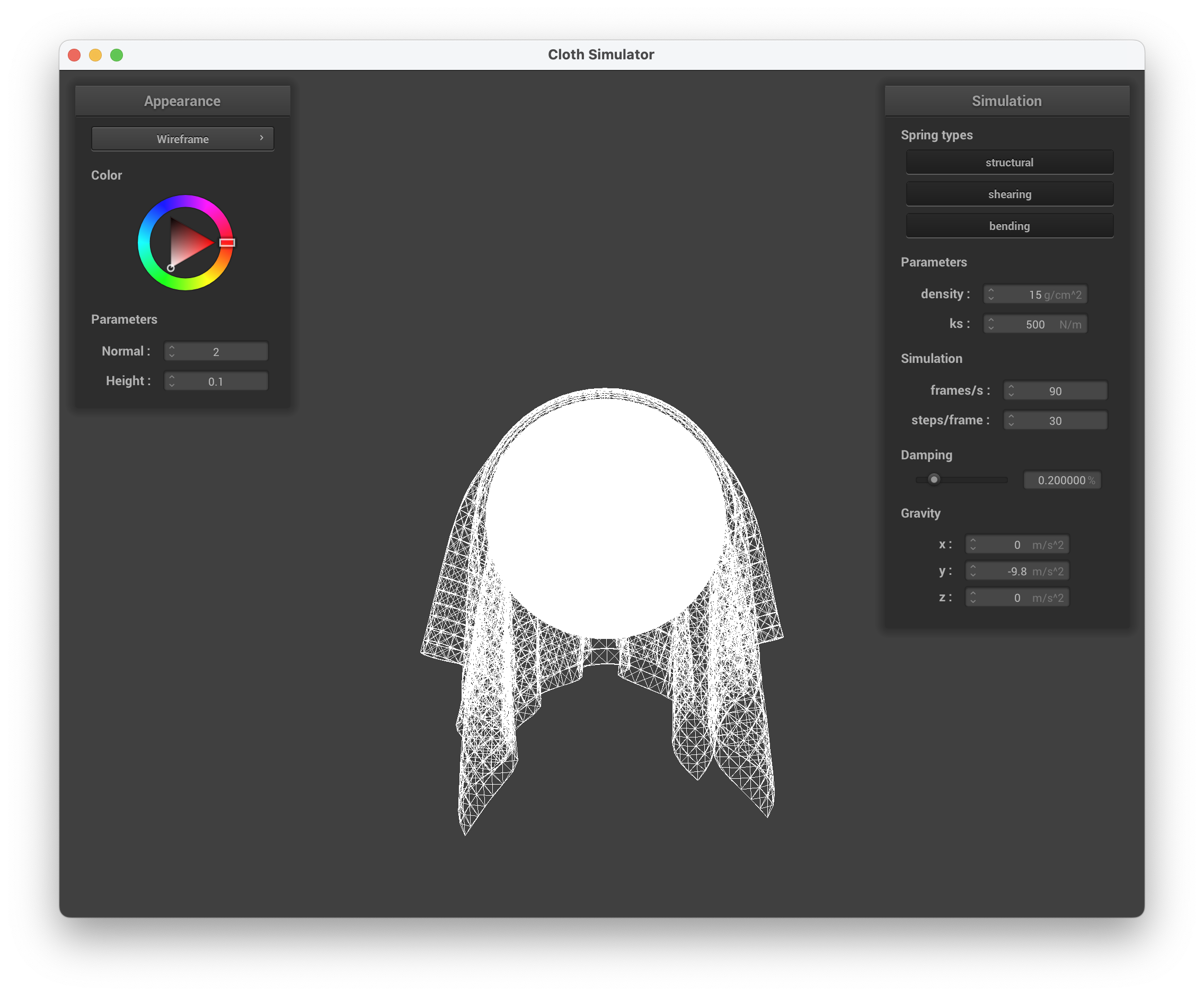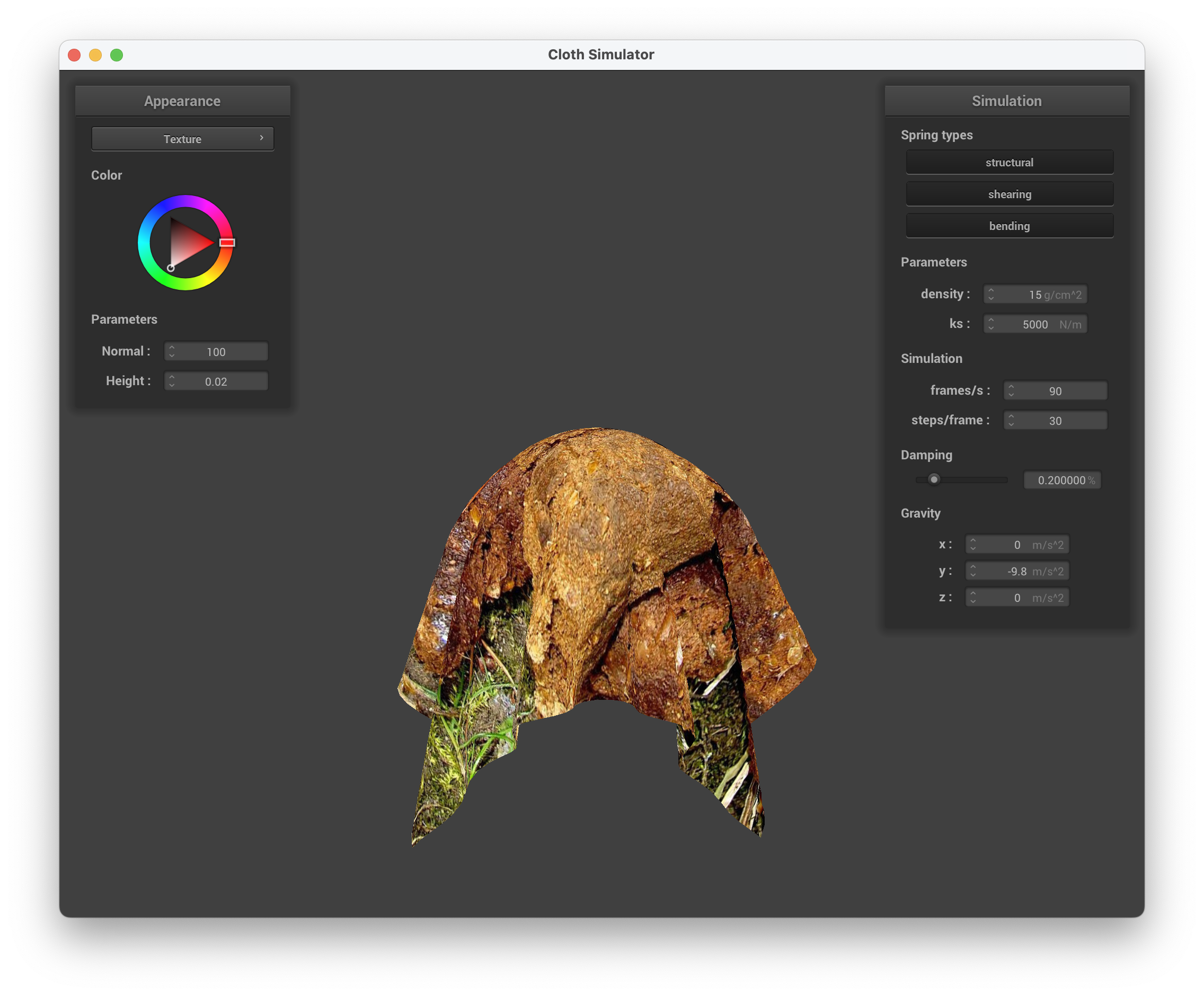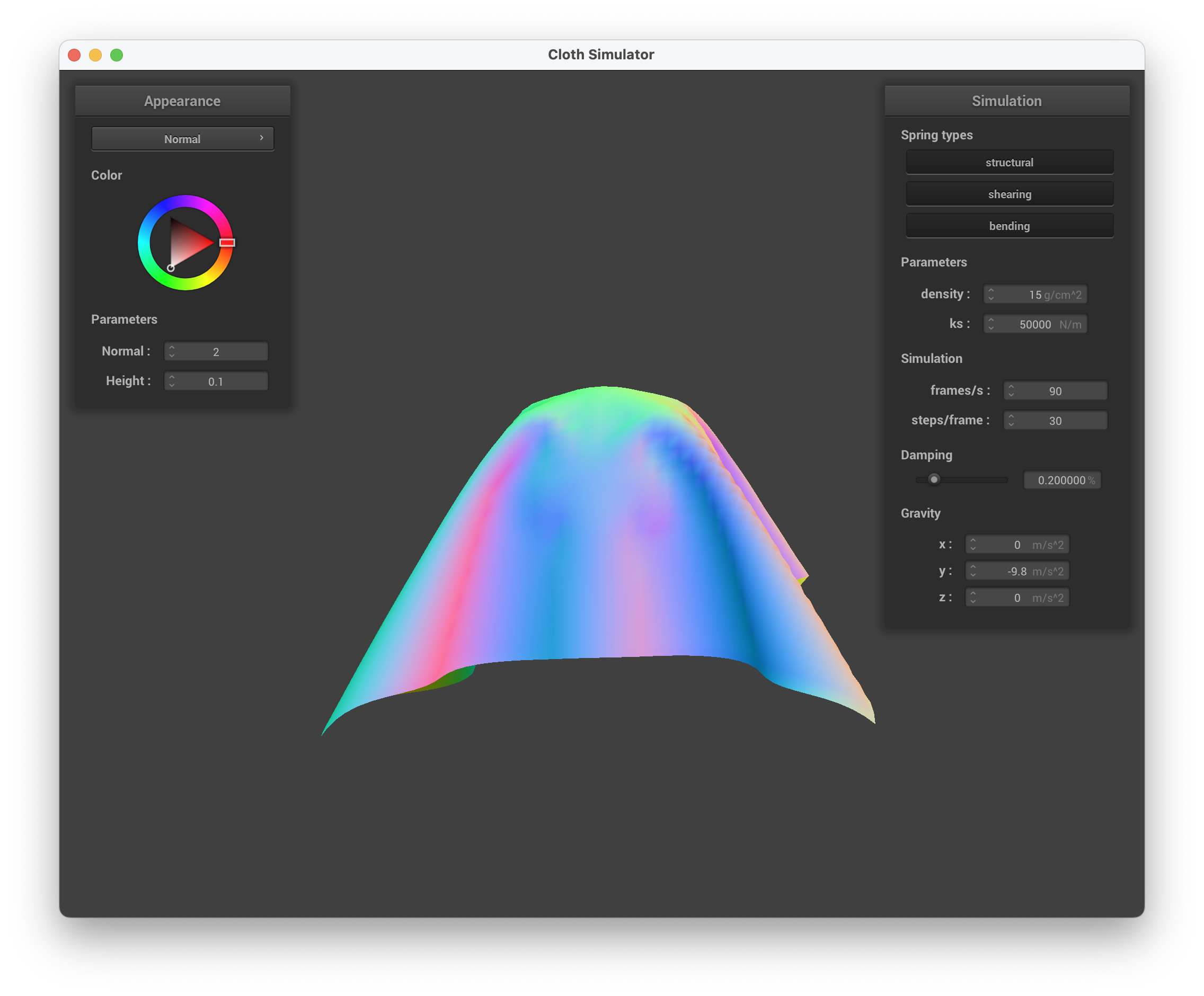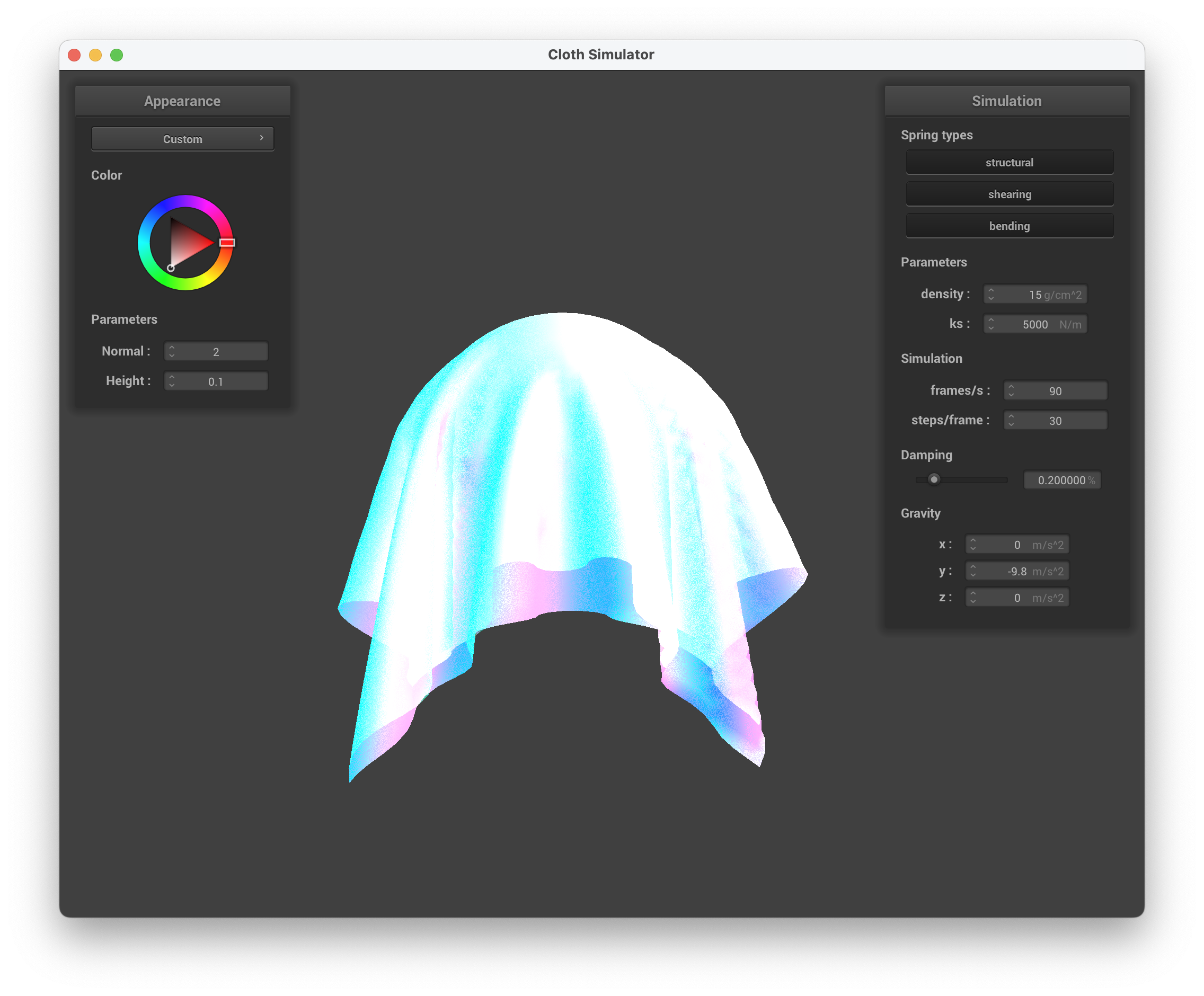 To help keep springs from being unreasonably deformed during each time step, we implemented an additional feature based on the SIGGRAPH 1995 Provot paper on deformation constraints in mass-spring models. For each spring, we applied this constraint to prevent springs from extending more than 10% greater than its rest_length at the end of any time step.