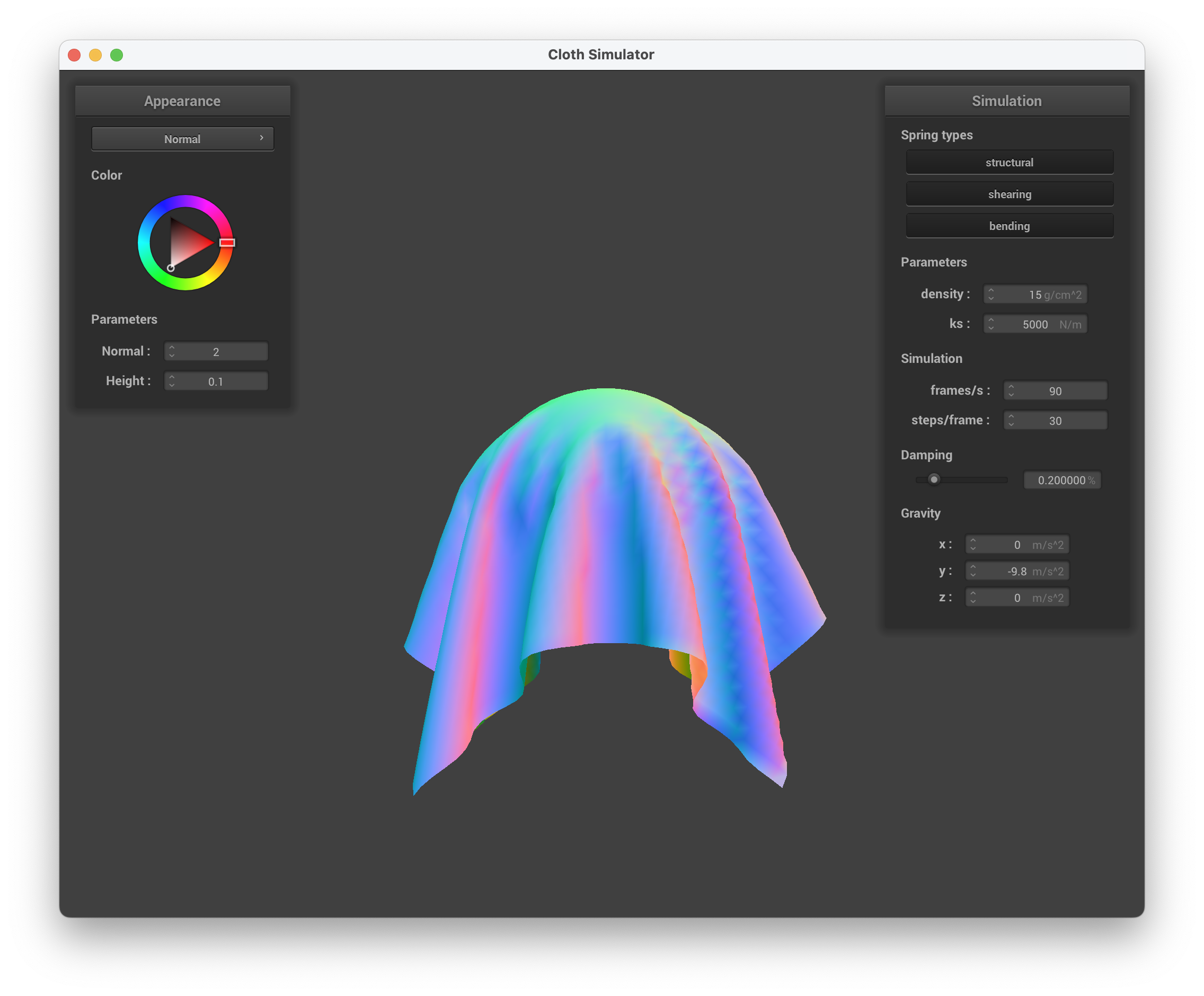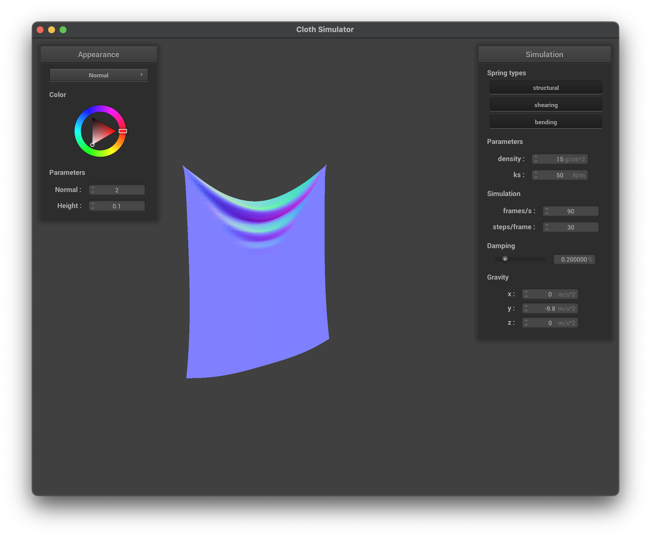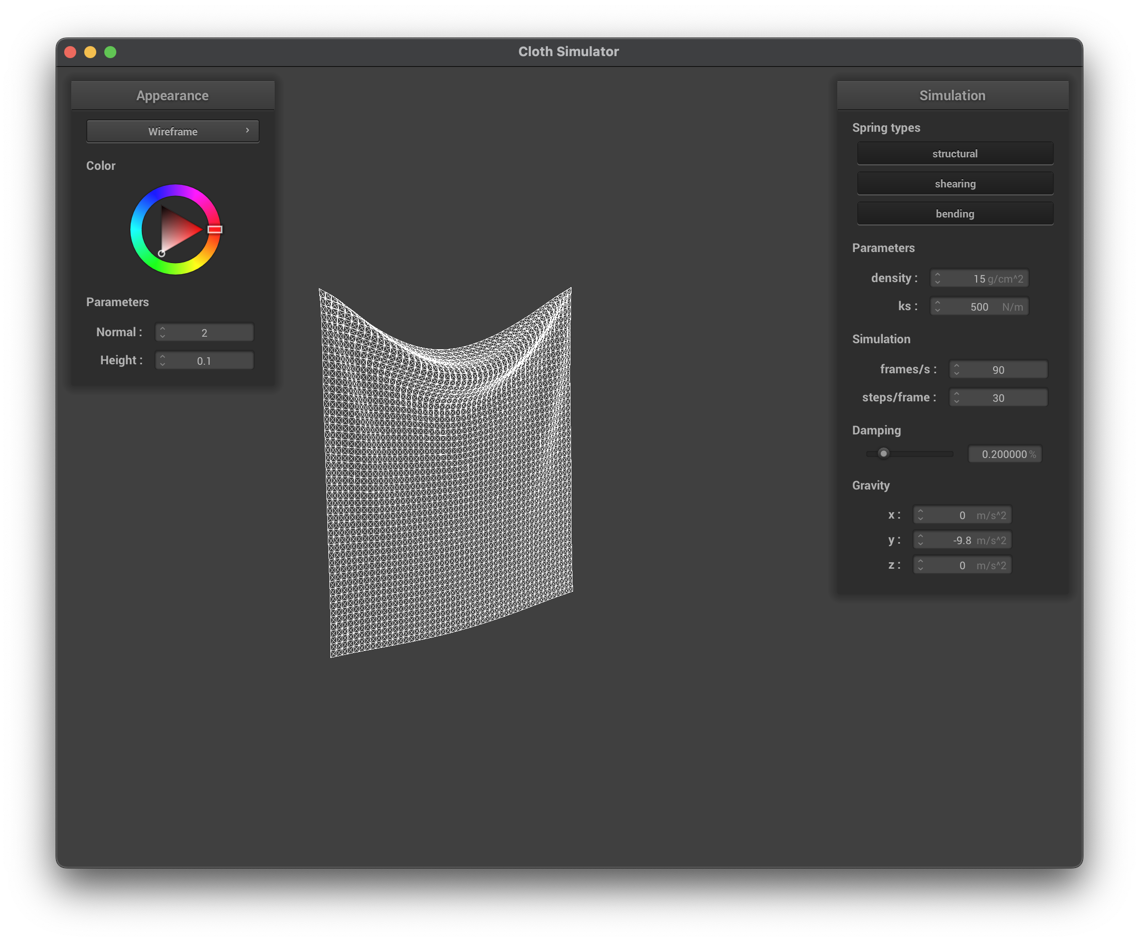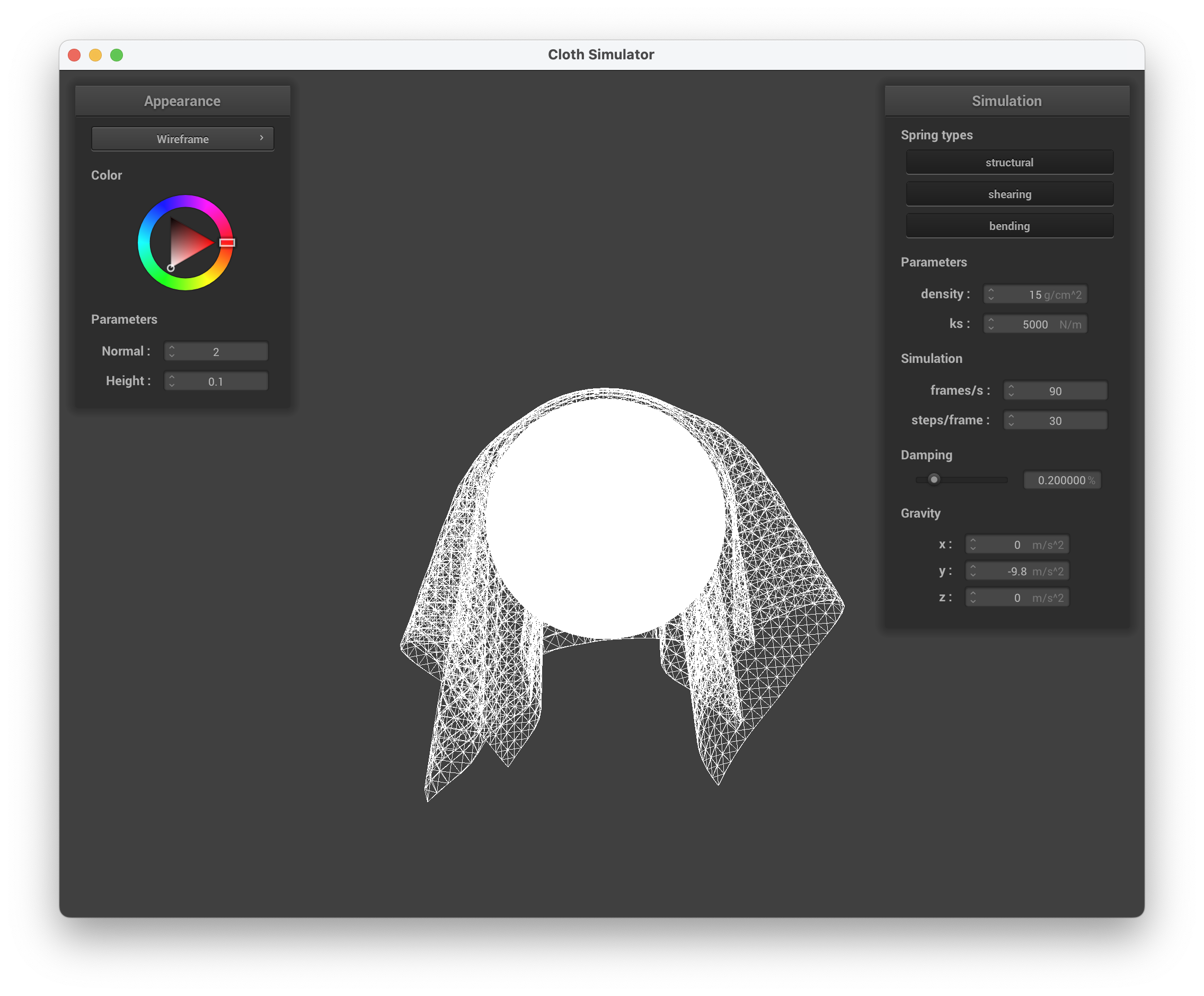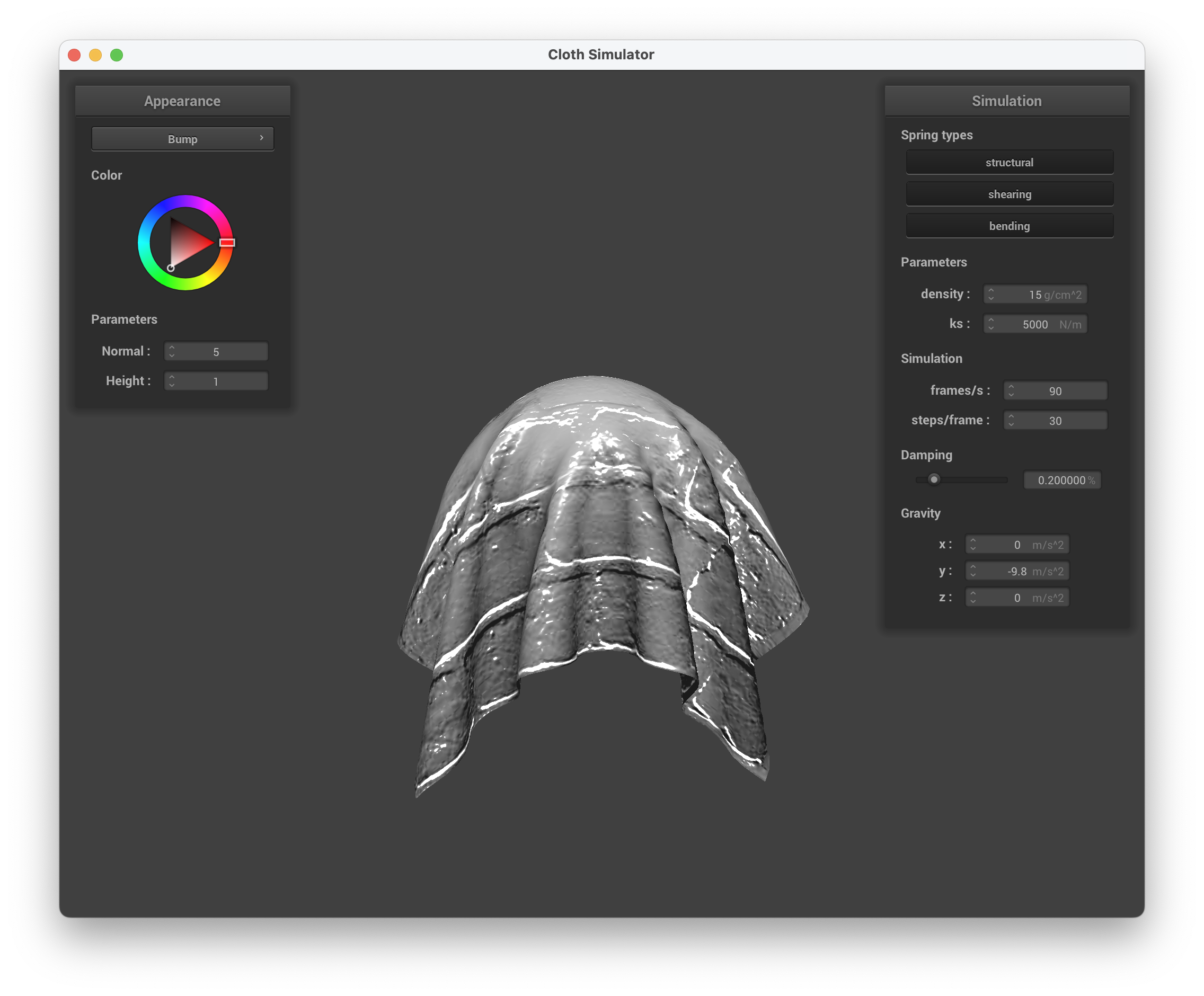 To help keep springs from being unreasonably deformed during each time step, we implemented an additional feature based on the SIGGRAPH 1995 Provot paper on deformation constraints in mass-spring models. For each spring, we applied this constraint to prevent springs from extending more than 10% greater than its rest_length at the end of any time step.