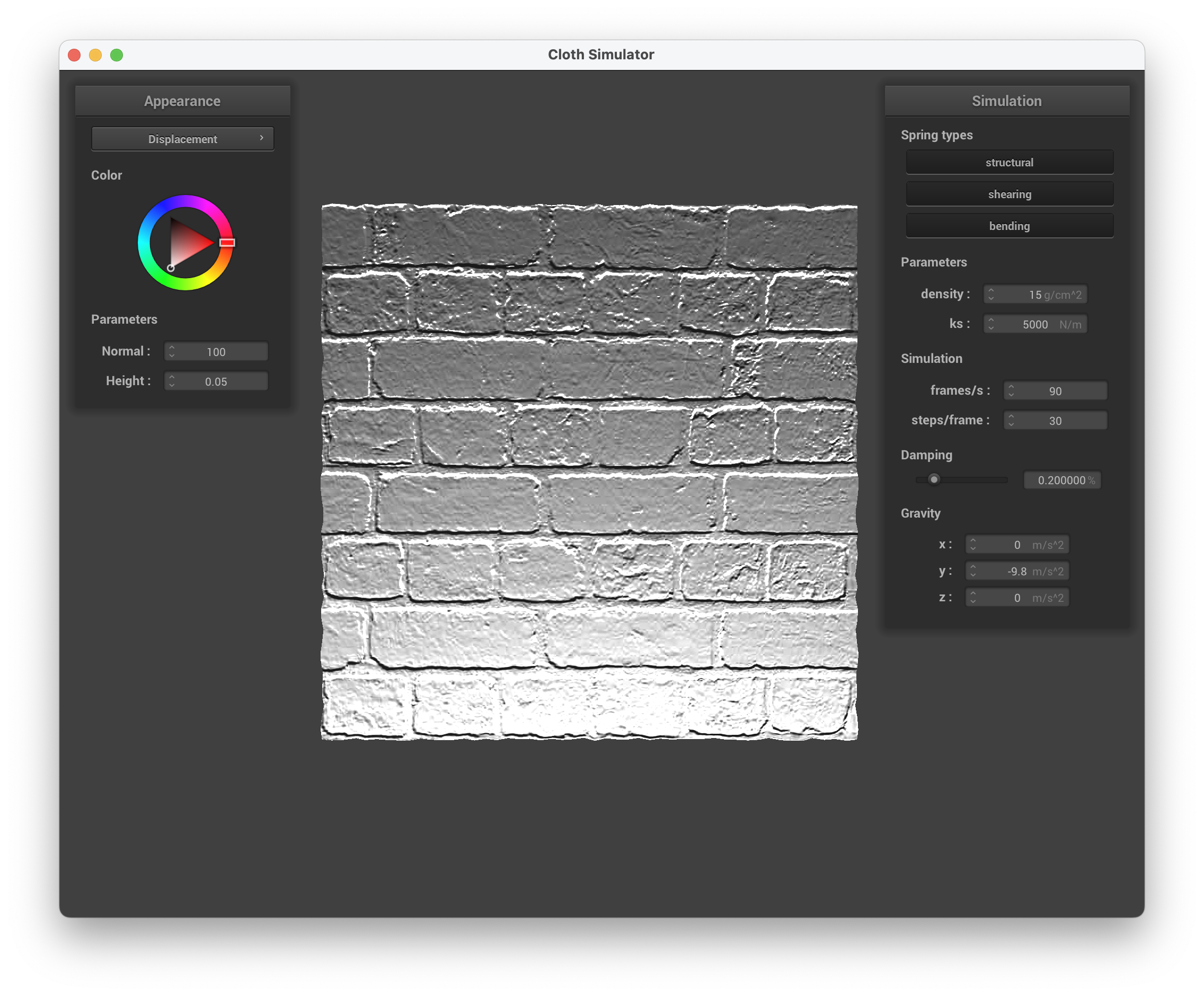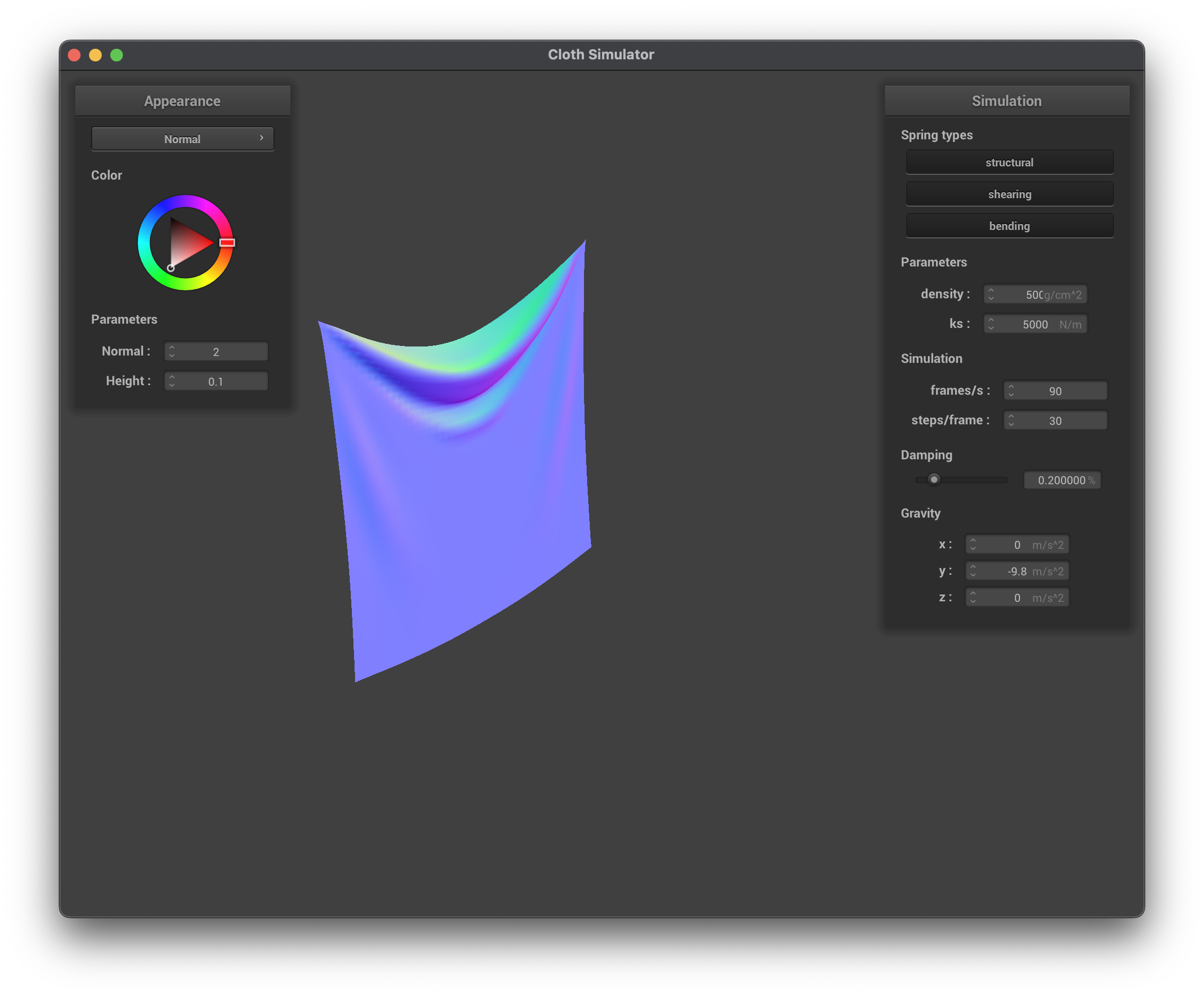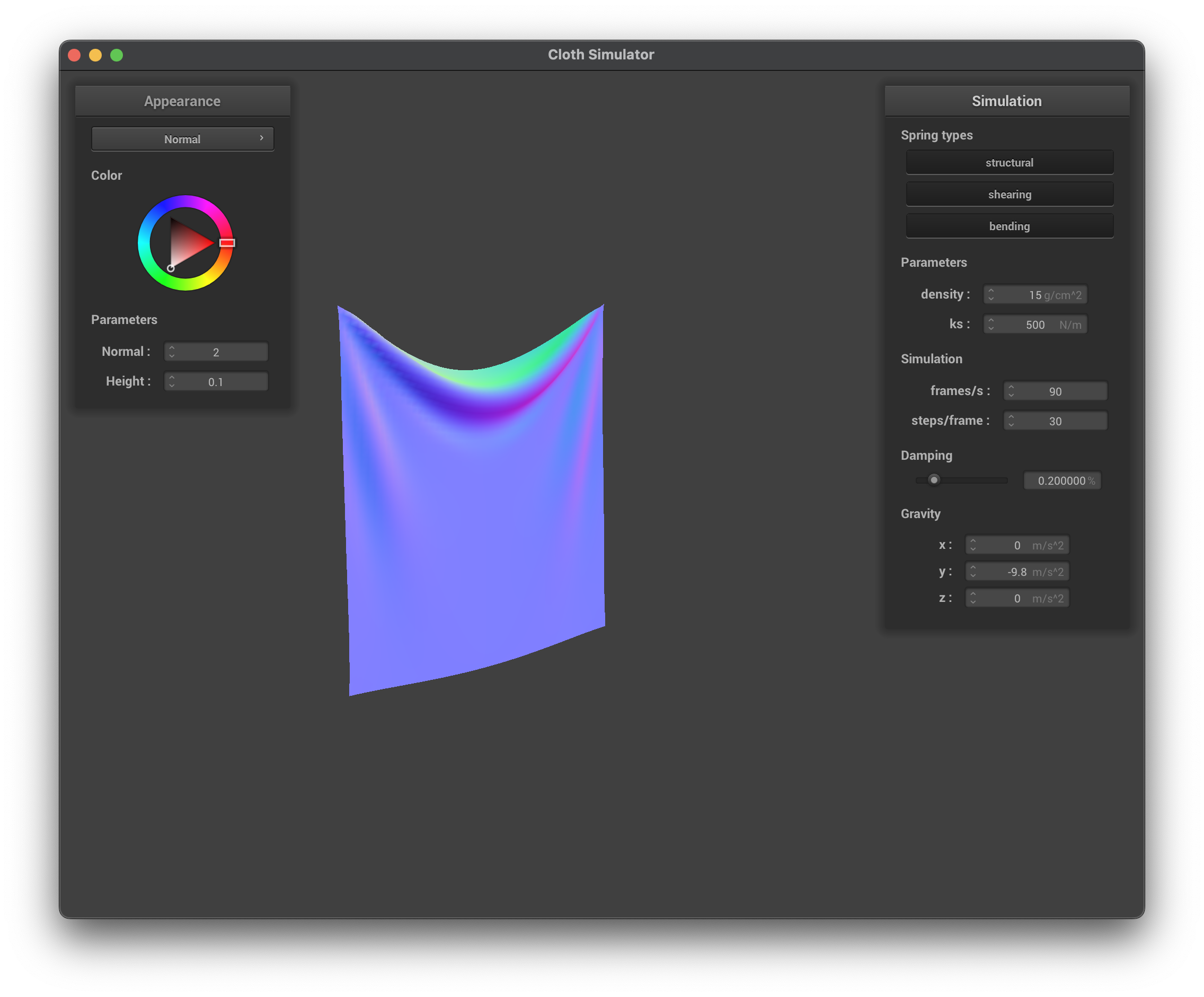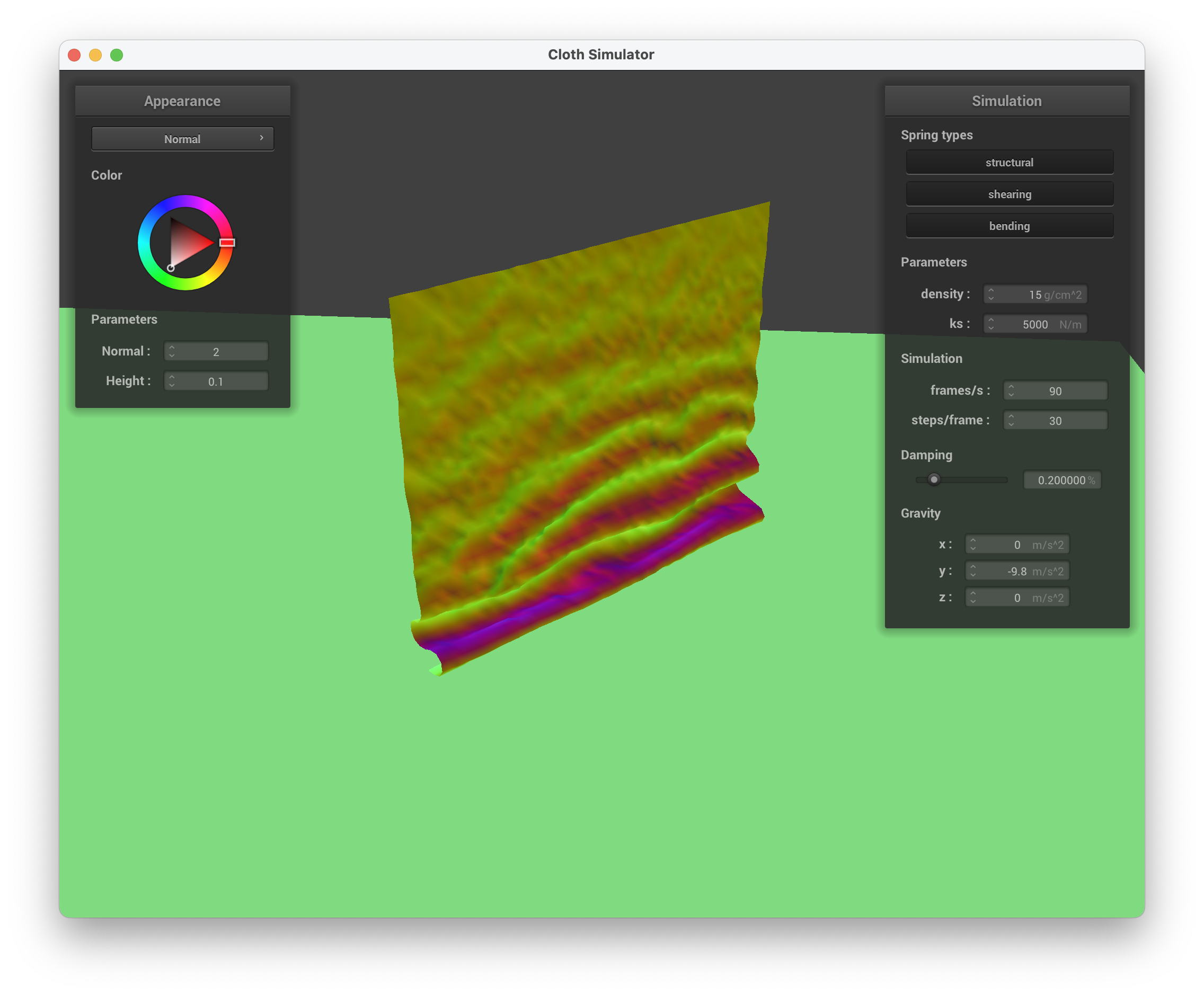 To help keep springs from being unreasonably deformed during each time step, we implemented an additional feature based on the SIGGRAPH 1995 Provot paper on deformation constraints in mass-spring models. For each spring, we applied this constraint to prevent springs from extending more than 10% greater than its rest_length at the end of any time step.