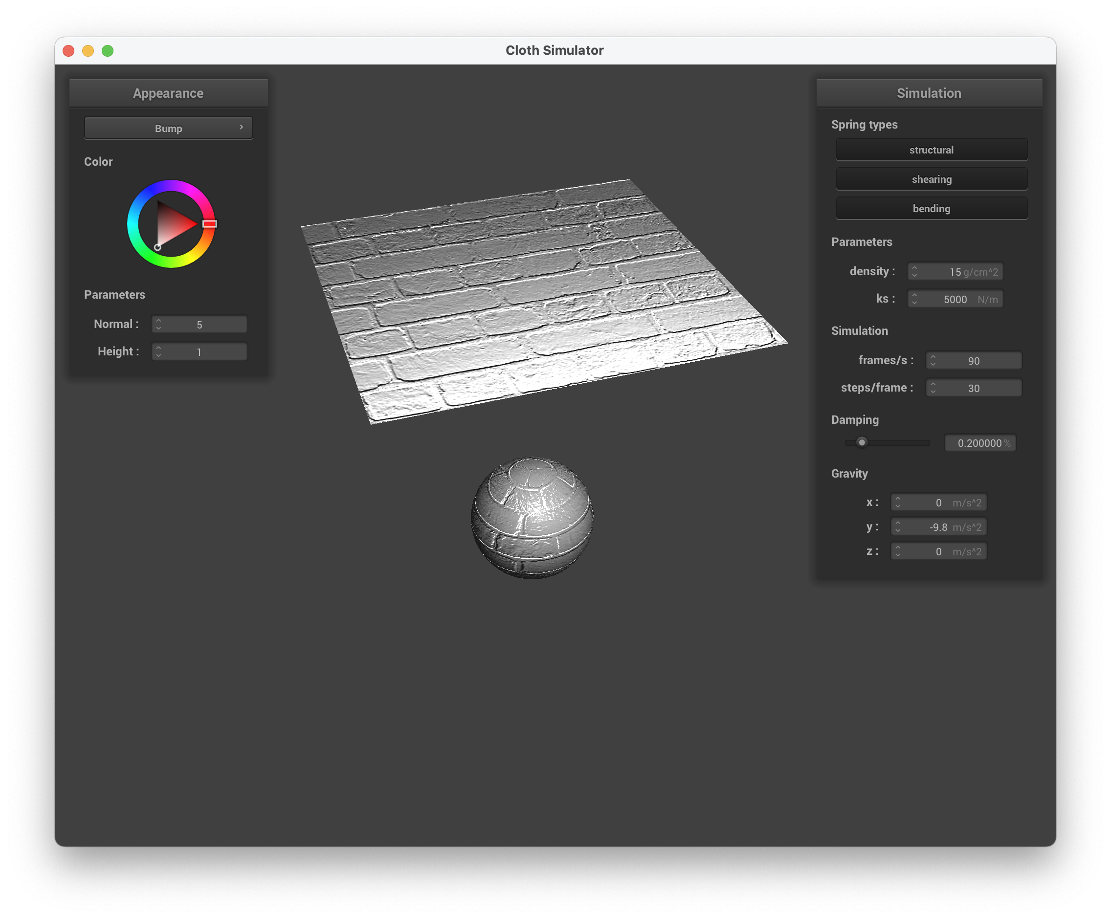 Show a screenshot of bump mapping on the cloth and on the sphere. Show a screenshot of displacement mapping on the sphere. Use the same texture for both renders. You can either provide your own texture or use one of the ones in the textures directory, BUT choose one that's not the defaulttexture_2.png. Compare the two approaches and resulting renders in your own words. Compare how your the two shaders react to the sphere by changing the sphere mesh's coarseness by using-o 16 -a 16and then-o 128 -a 128.