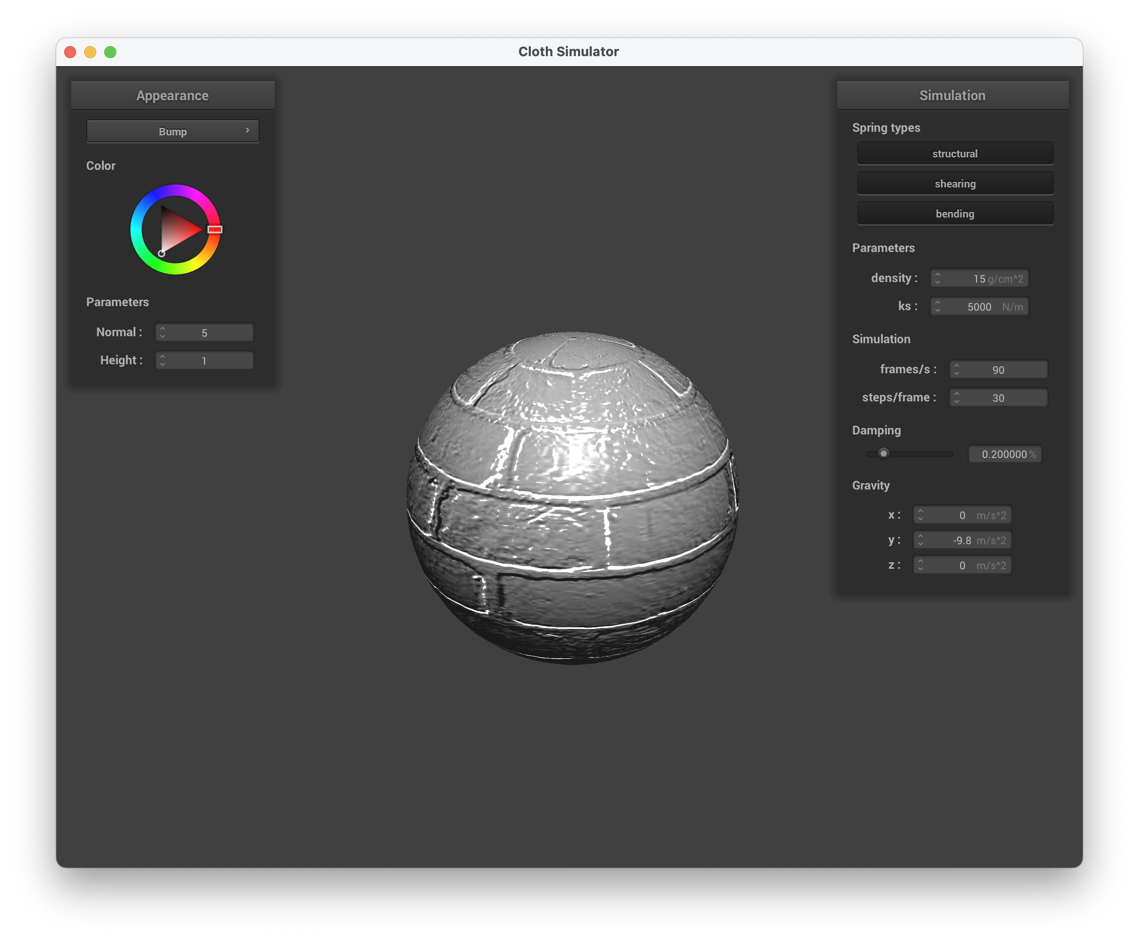 Below are screenshots of running ./clothsim -f ../scene/sphere.json with bump mapping, setting the normal to 5 and height to 1, using texture3.png.