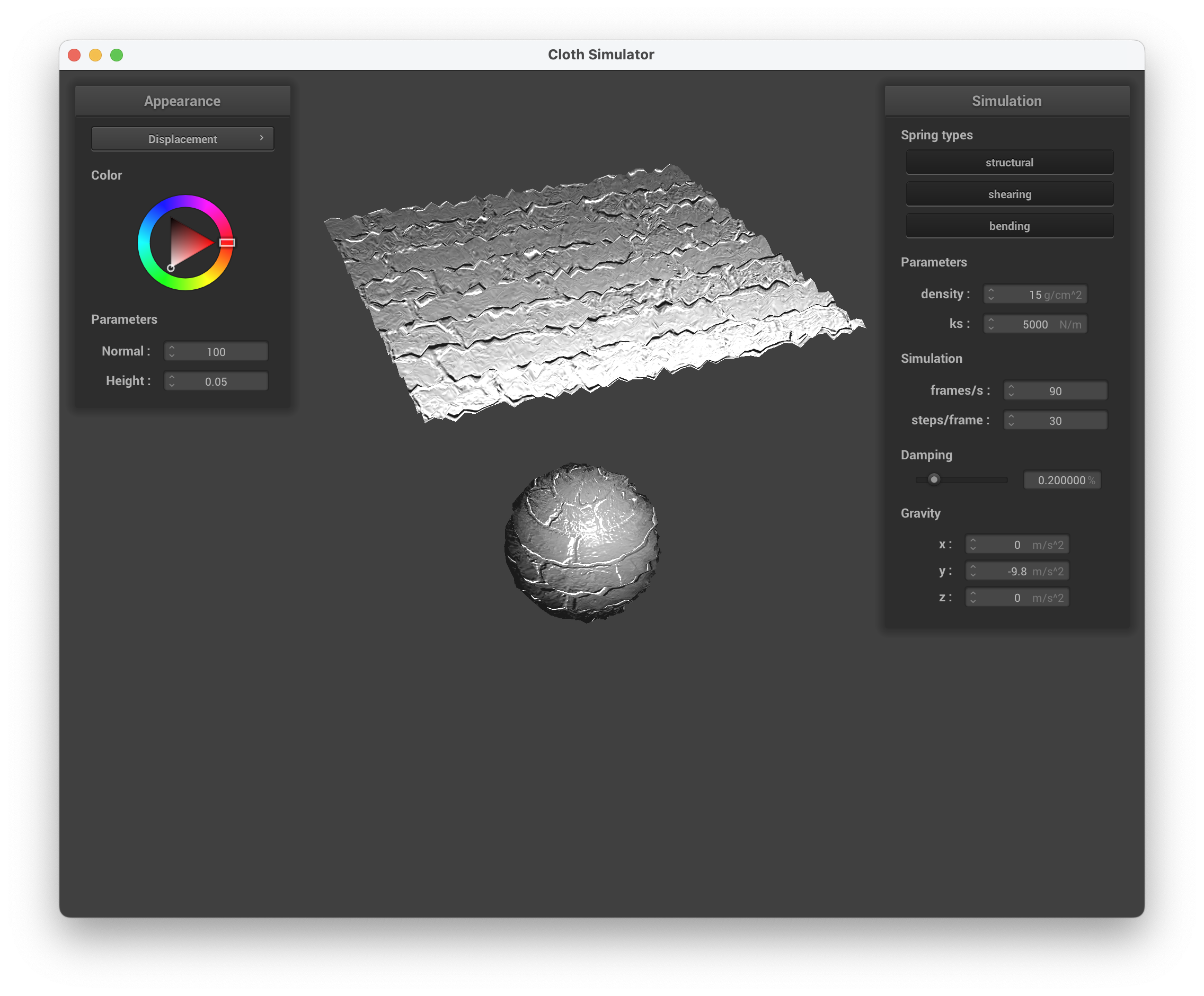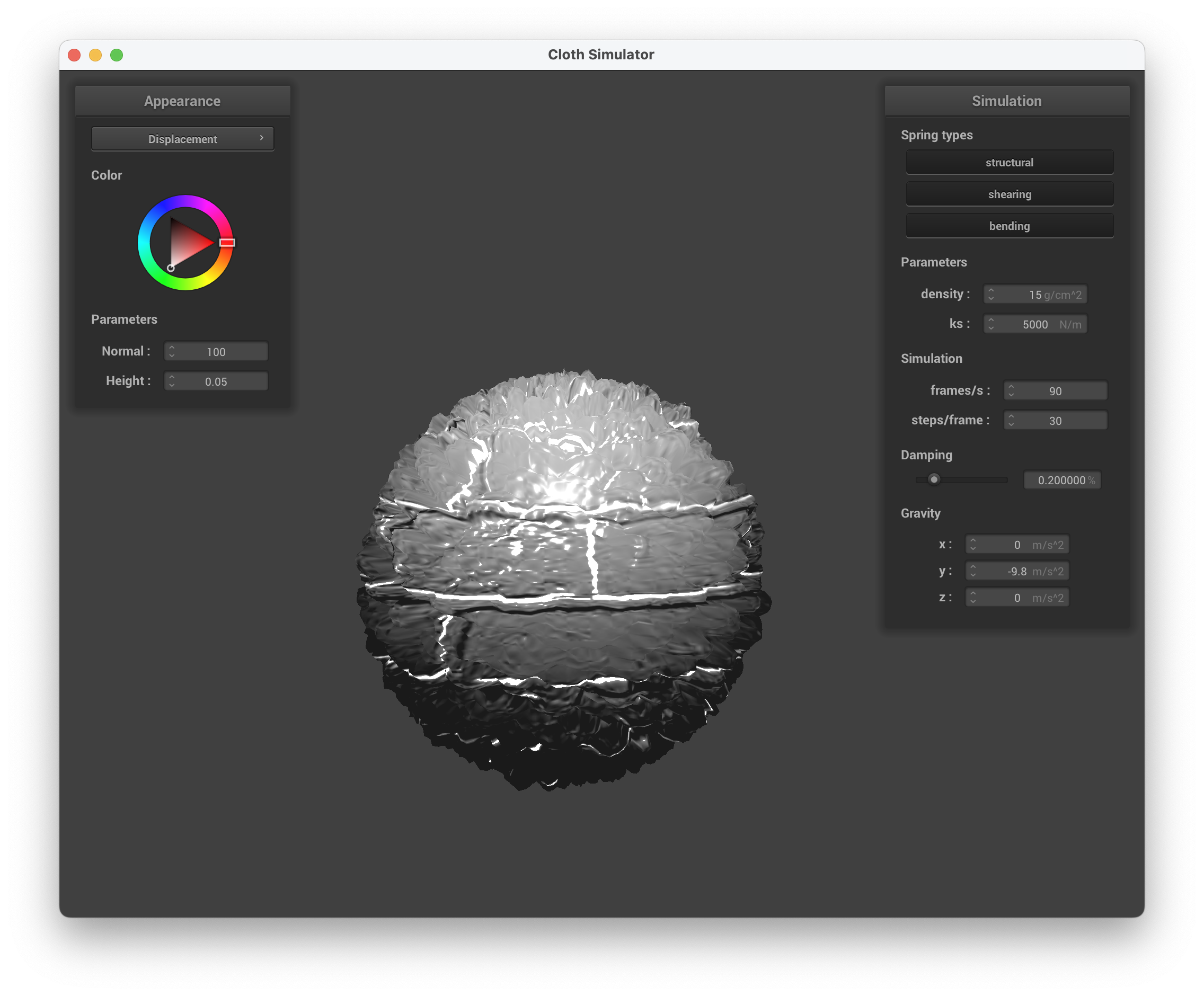 Below are screenshots of running ./clothsim -f ../scene/sphere.json with displacement mapping, setting the normal to 100 and height to 0.05, using texture3.png.
