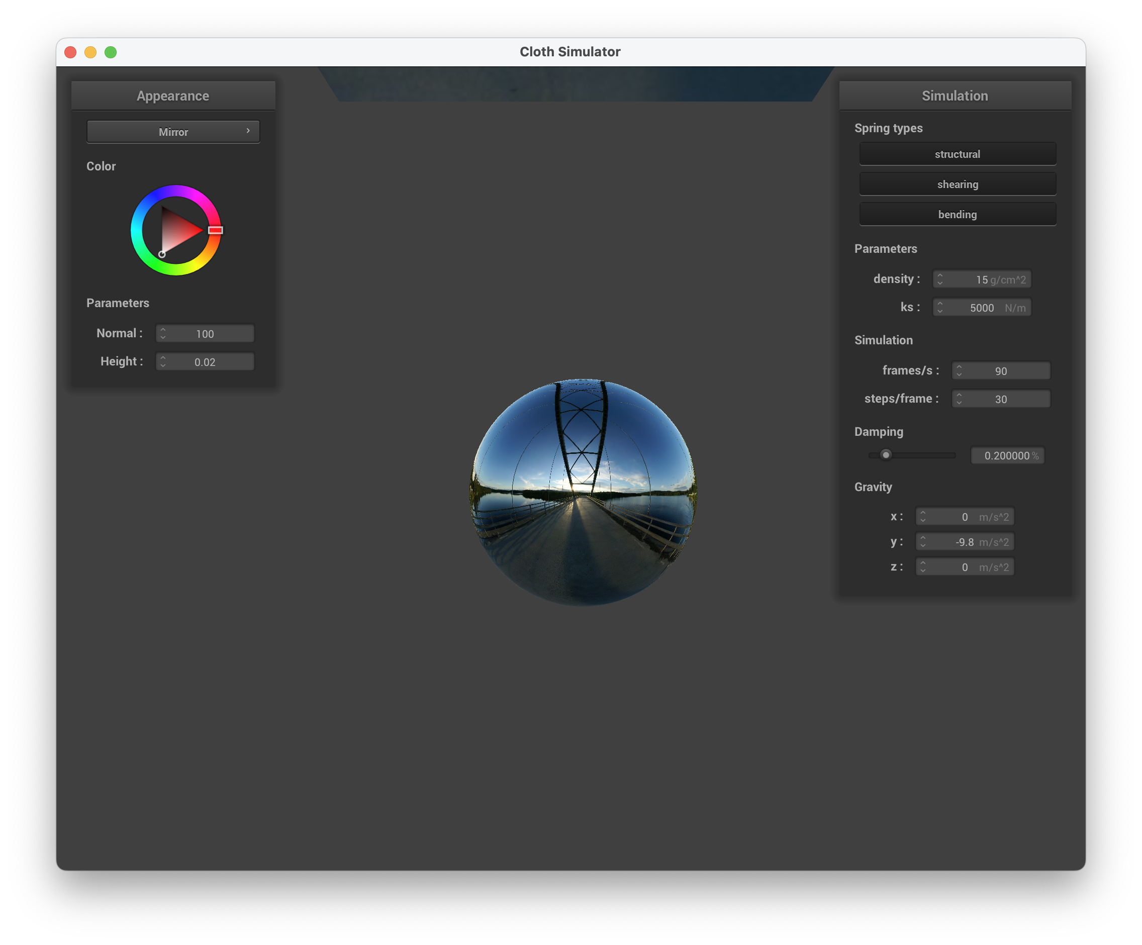 Show a screenshot of your mirror shader on the cloth and on the sphere.